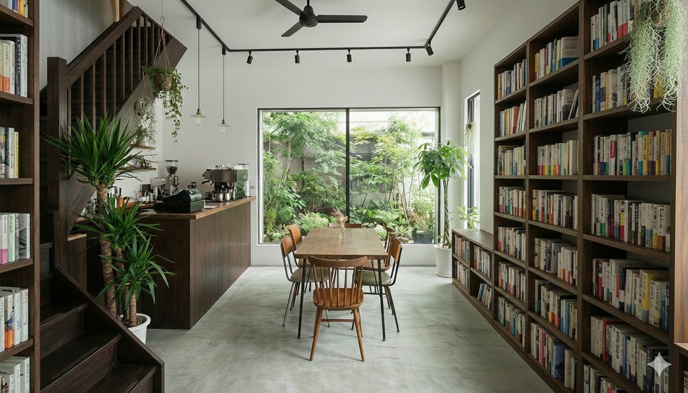 2階: オフィス兼配信スタジオ。本から得た知見を共有し、世界中と対話するための静かな発信拠点です。オンラインお話会などを隔週で提供していくつもりです。本を通じて知り合えたお客様との交流も、私にとって大切な宝物です。