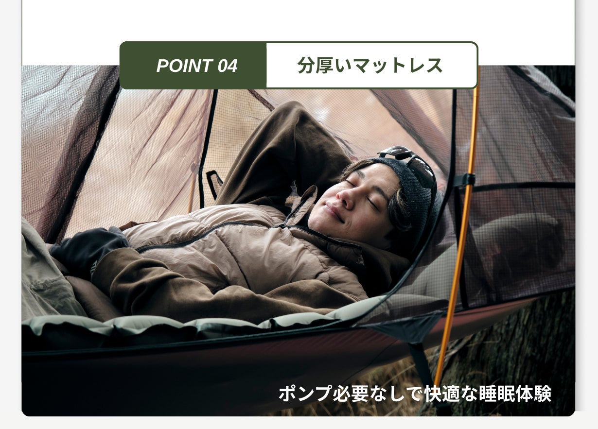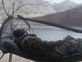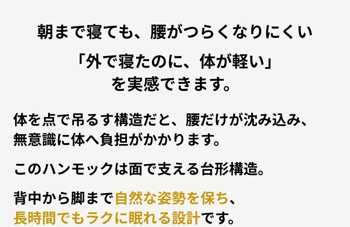2026/04/09 09:09皆さま、こんにちは。昨日の続きで、素材選びのお話です。ハンモックの生地に求められる性能は、相反するものばかりです。- 軽くて丈夫であること- 肌触りが良いこと- 適度に伸縮すること(伸びすぎても伸びなさすぎてもダメ)- 通気性があること - 速乾性があること特に難しかったのが「適度な伸縮」です。フルフラットを維持するには、体重がかかった時に一定量だけ伸び、それ以上は伸びないという絶妙なバランスが必要でした。最終的にたどり着いたのは、高密度のナイロンをベースにした特殊な織り方の生地です。縦方向と横方向で異なる伸縮率を持たせることで、フルフラット構造を体重80kgの方でも維持できる設計になっています。(※耐荷重は150kg)実際に触っていただくと「サラッとしているのにしっかりしている」という感想をいただきます。この感触は、スペック表だけでは伝わらないこだわりです。 もっと見る試作1号機の話──「全然フラットじゃない…」