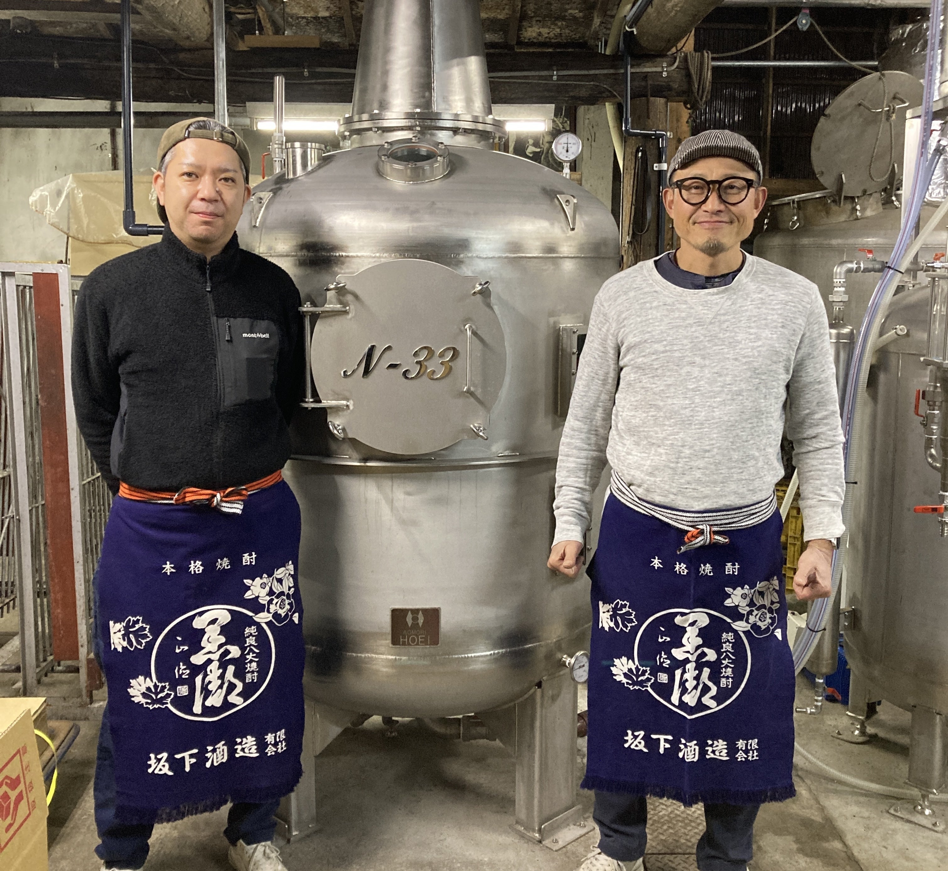 坂下酒造 代表 沖山範夫さん(右) と 新導入の減圧蒸留機「N-33」
