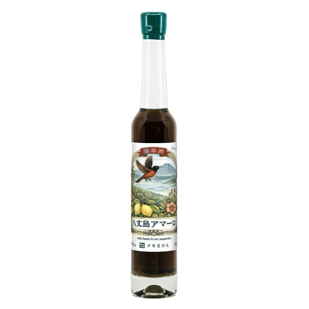 製造は、伊勢屋酒造の元永達也。素材の個性を引き出す薬草酒づくりの技術によって、八丈島の風土そのものを、一本に閉じ込めています。
