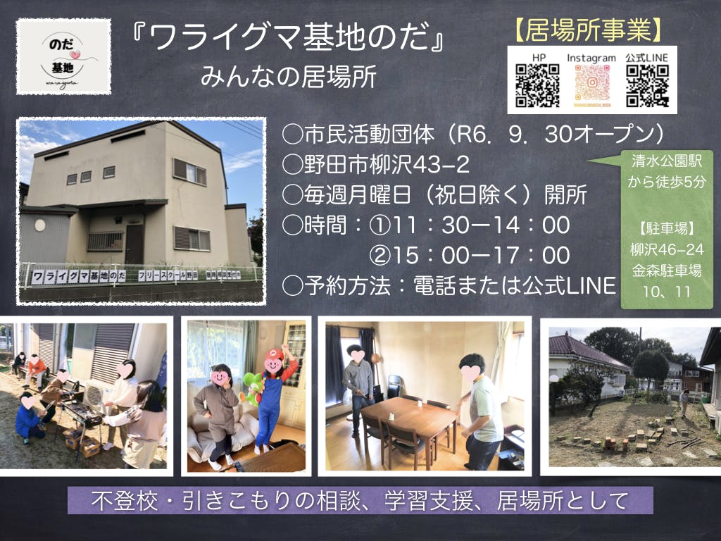 ワライグマ基地のだのHPと子どもの居場所にお名前(ニックネームでも可)やリンク等を掲載させていただきます。