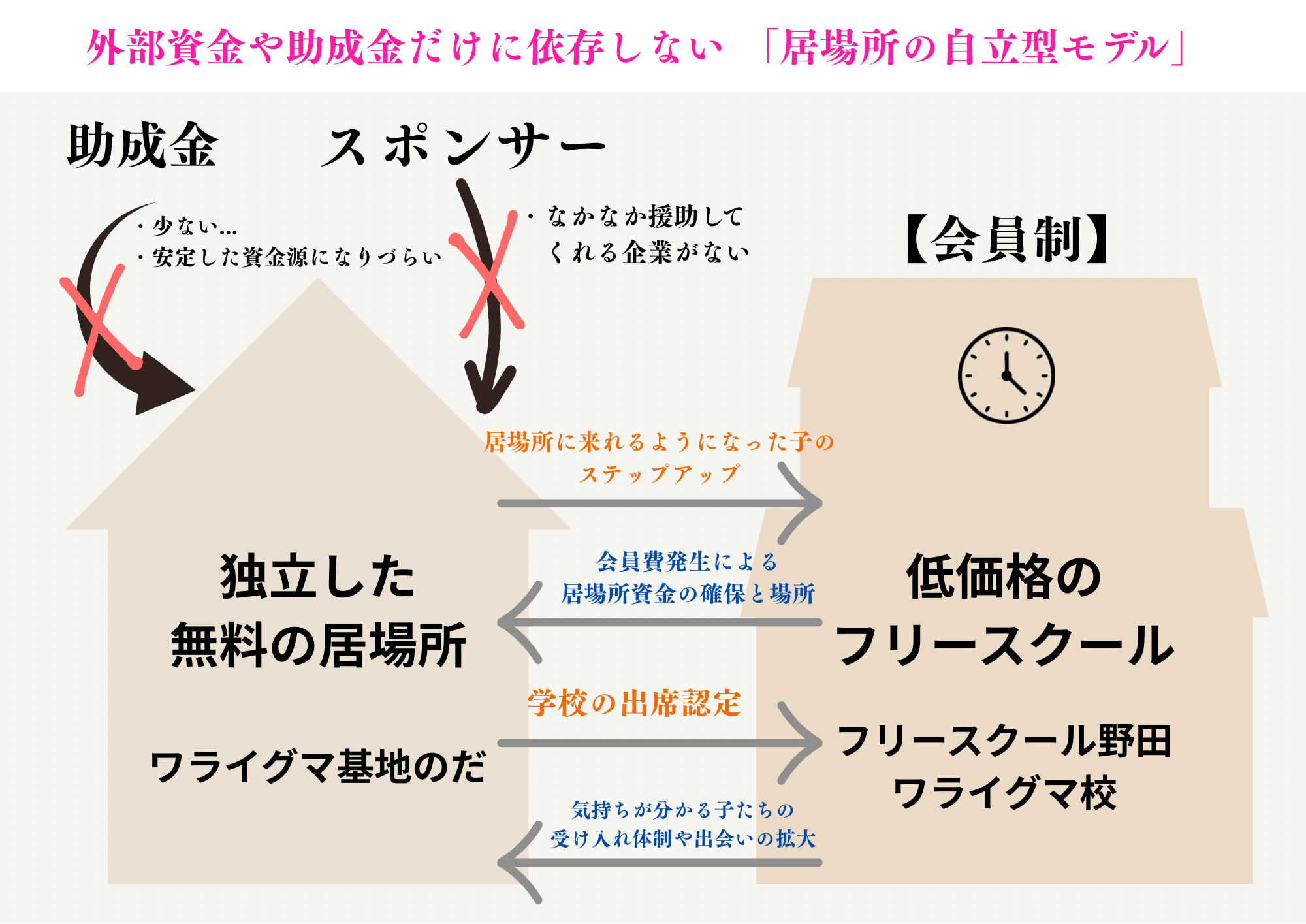 そのフリースクールが自らスポンサーとなり事業収益の多くを、市民活動団体ワライグマ基地のだの活動費(特に無料の居場所運営費)に充てています。