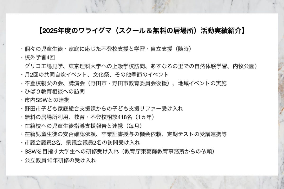 居場所を長く持続させるための自主財源モデルとして、別団体でフリースクール【フリースクール野田ワライグマ校】を立ち上げました。