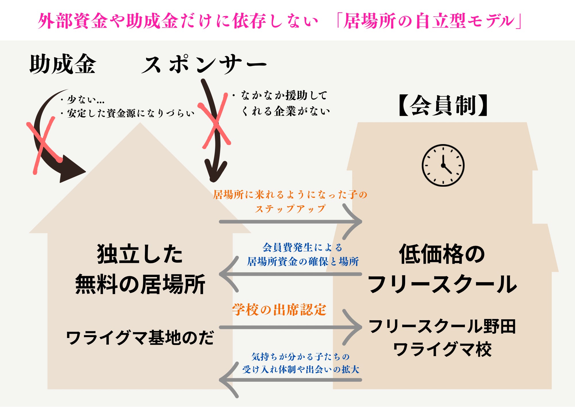そのフリースクールが自らスポンサーとなり事業収益の多くを、市民活動団体ワライグマ基地のだの活動費(特に無料の居場所運営費)に充てています。