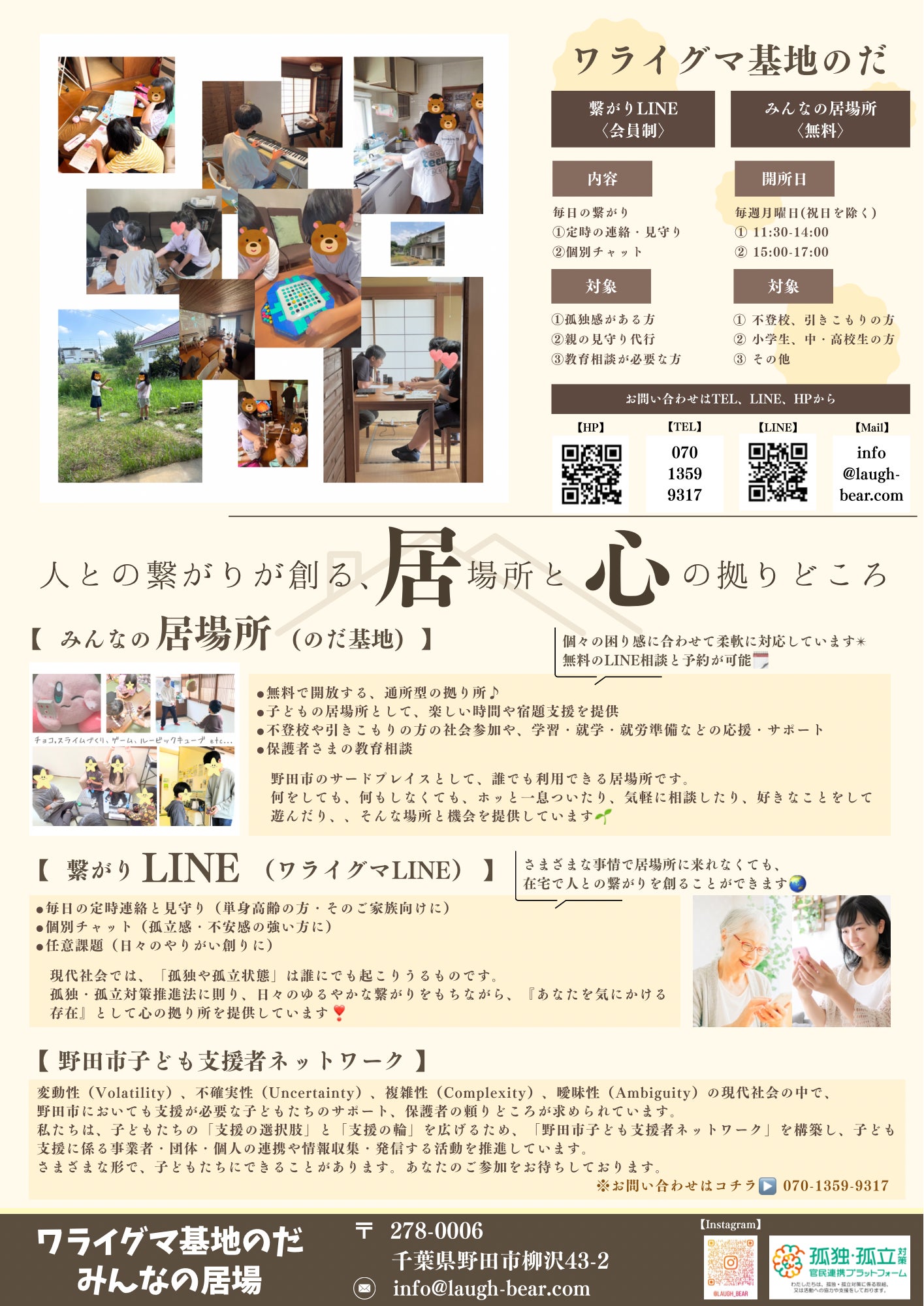 ワライグマ基地のだのHPと子どもの居場所にお名前(ニックネームでも可)やリンク等を掲載させていただきます。