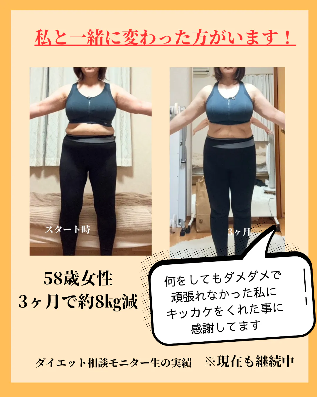 一緒に取り組んだ58歳の女性が、3ヶ月で約8kg減を達成しました。