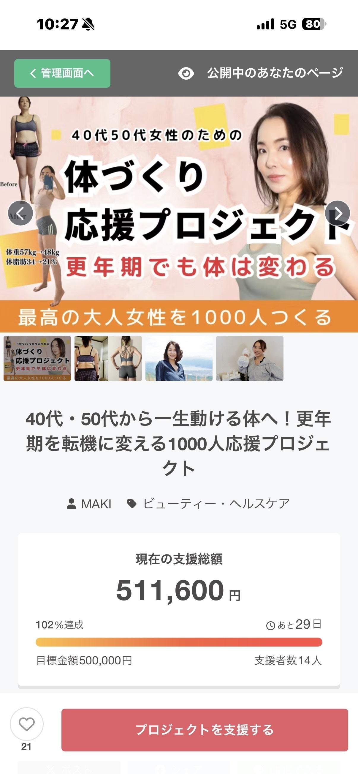 2026/03/21 11:18【ご報告】クラウドファンディング開始からちょうど1週間。皆さまのご支援のおかげで目標金額50万円を達成しました!本当にありがとうございます。正直言います…ここまで来るとは思っていませんでした。今回のプロジェクトはただの「応援」ではなく「自分の体を変えるきっかけ」として届けたいと思っていました。実は「この内容で伝わるのか?」と悩みながら内容を修正している途中でした。それでも支援してくださったこと、本当に感謝しています。ここからが本番です!このプロジェクトの本当の目的は更年期でも体は変わるという事実を広めることそして「もう歳だから」とあきらめている女性を減らすことこの先も元気で動ける体作りをすることです。だから、ここで終わりにはしません。次の挑戦について現在、次の目標(ネクストゴール)を準備中です。より多くの方に届けるために内容も含めてしっかり設計しています。準備が整い次第、改めてご報告します。最後に昔の私は「ダイエットは明日から」「もう歳だから仕方ない」そうやって逃げていました。でも、変われました。だからこそ伝えたい!体は、何歳からでも変わる。ここからが本番です。引き続き、応援よろしくお願いいたします。 もっと見る