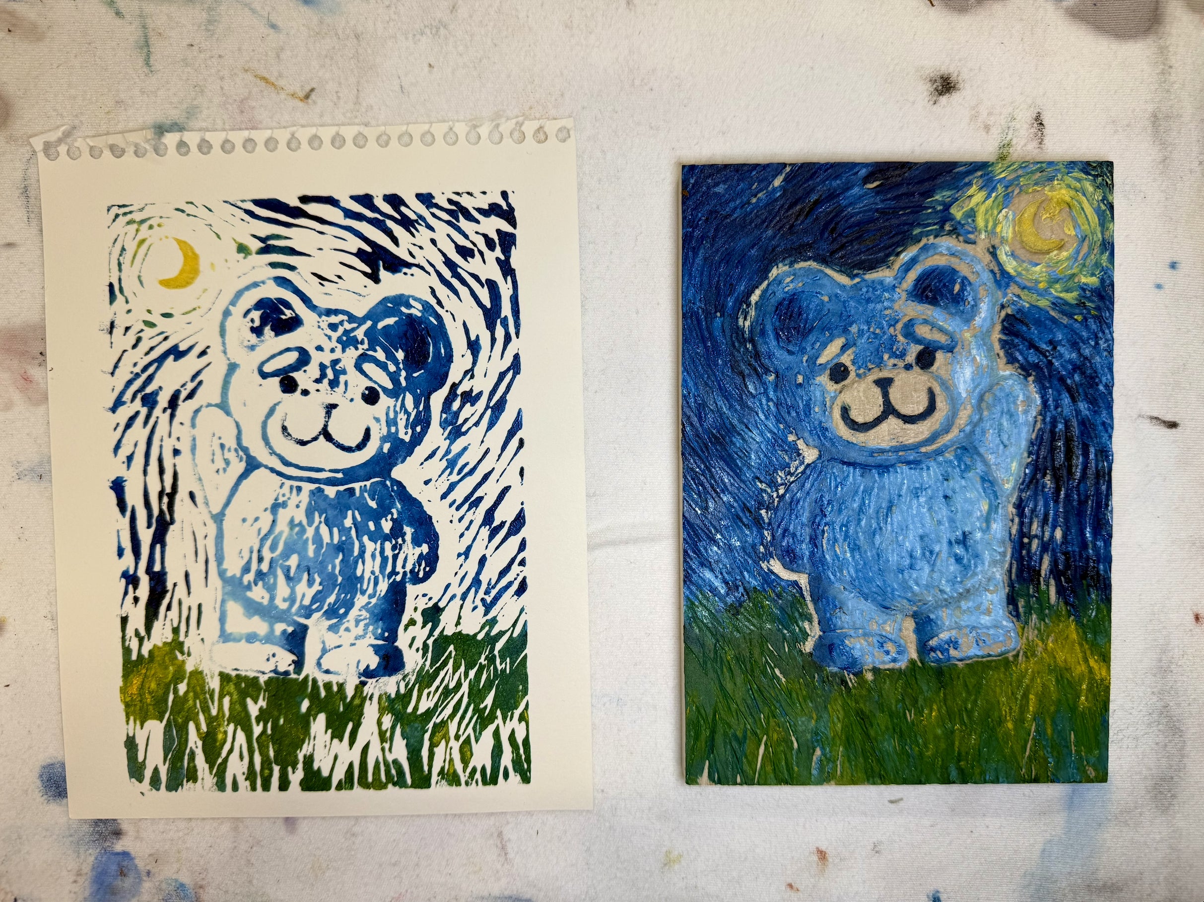 2026/04/09 12:56天才の皆さんこんにちは!どうも!天才ペイント聖矢です!栞の制作を進めるペイント聖矢前回の活動報告で投稿した栞制作、「Starry Bookmark」の原画がついに完成しました!全部で20個の星座と流れ星が描かれています!そして、ペイント聖矢のサインや「隠れ熊五郎」も!?笑ペイント聖矢のサイン隠れ熊五郎(せっかくの星座とか俺のサインとか分断されたら悲しい。。。笑 でも、それもこの栞の味だよな!)制作風景はショート動画やYouTubeの横動画で公開予定なのでぜひチェックしてください!▼ペイント聖矢のYouTubeチャンネル▼https://www.youtube.com/@paintseiyaそして、なんと...このクラウドファンディングが50%を達成しました〜!!!(めちゃくちゃ嬉しい。最高だぜ。泣)みんな本当にありがとう!!!みんなのおかげでここまで来ました!この達成を記念して、ペイ聖ファミリー(ペイント聖矢、マネージャー、Mr.コウ)で『達成記念LIVE配信』をします!(他にも参加者がいるかもしれないが…とりあえず、この3人は確定)配信日時はまたご連絡します!達成が嬉しすぎたので、詳細が決まる前にご報告です!笑お楽しみに!そして....(情報が盛り沢山だな笑)YouTube動画にやたらと、いいねがついているコメントを発見!おいおい、なんだこのコメントは!? (ちゃっかり、ハートしてますが笑)俺は画家だぞ? それに、版画なんて小中学生以来...とりあえず、まあやるけどさあ?というわけで、彫っております!!!(彫りすぎて、指が痛いんですが....)真剣な表情でペイントするペイント聖矢彫った木版に油絵の具でペイントして、こんな感じに出来上がりました!え、めちゃくちゃ可愛くないか?こちらペイント聖矢アートショップにて、数量限定でただいま販売しております!てなわけで、いつもみんな応援ありがとう!!!100%目指して一生懸命頑張り続けますので、どうぞ引き続き応援のほどよろしくお願いします!みんな最高だぜっ! もっと見る
