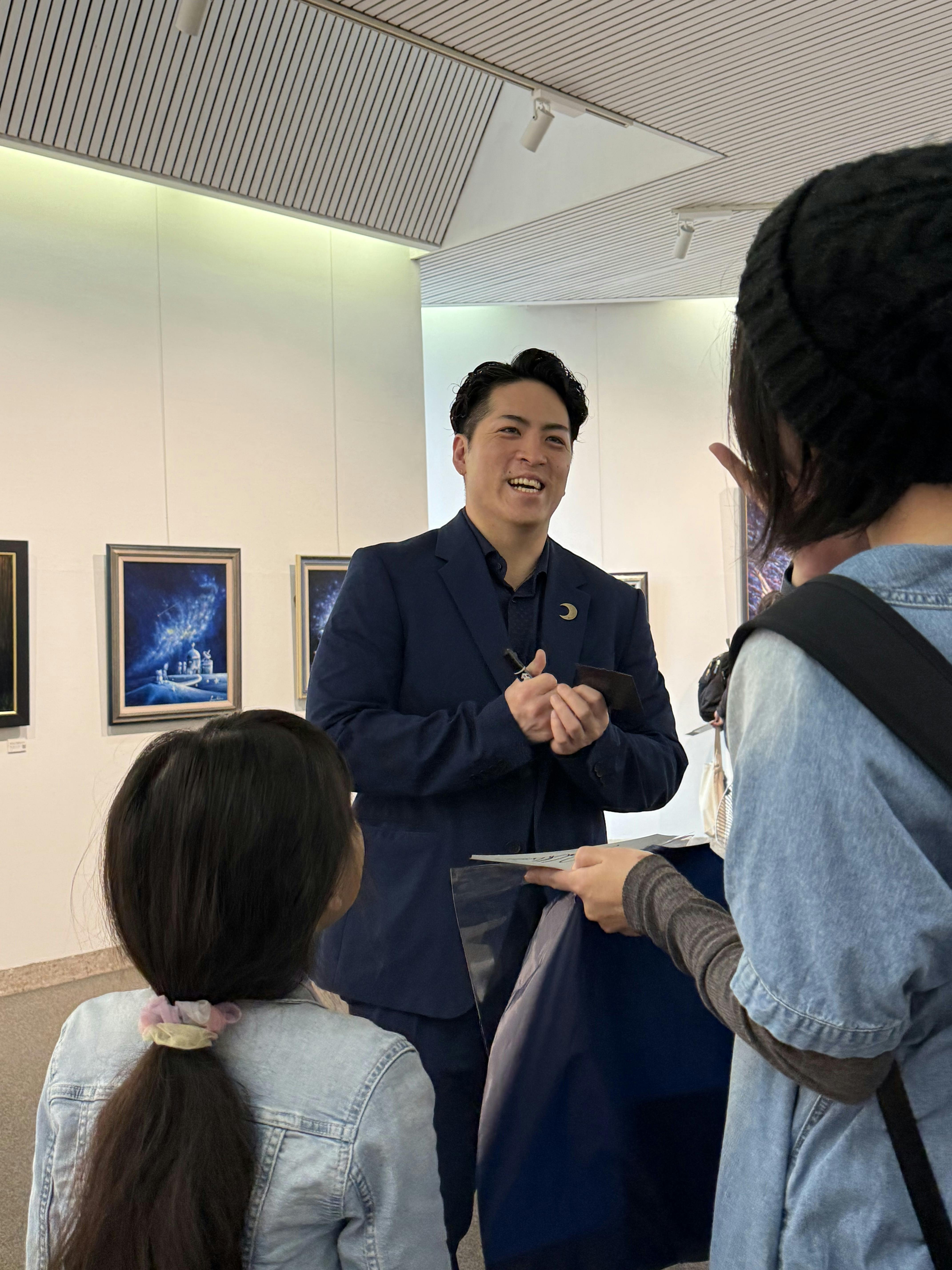 作品の前で微笑む人や、