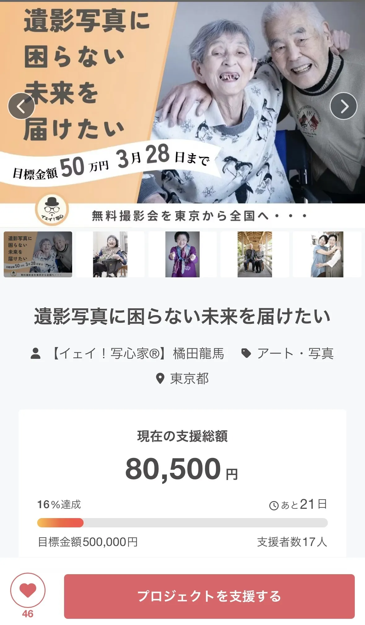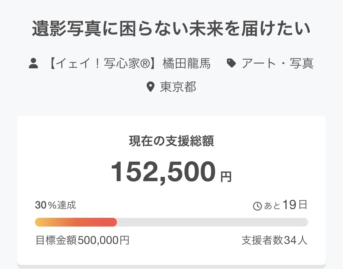 2026/03/09 07:00イェイ!写心®︎プロジェクトチームリーダーの久東裕次(くとうゆうじ)です。3月6日に公開したクラウドファンディングですが、現在 34名の方からご支援をいただき、152,500円(30%) を達成しました。ご支援くださった皆さま、そしてシェアや応援の声を届けてくださっている皆さま、本当にありがとうございます。私たちが届けたいのは、「遺影写真に困らない未来」です。歳を重ねると、人は写真を撮る機会が少なくなります。そして突然の別れの中で、遺影として使える写真が見つからないという現実があります。だからこそ私たちは、元気なうちに笑顔の写真を残す文化を広げていきたい。今回のクラウドファンディングは、東京で無料の遺影写真撮影会を開催し、この活動を広げていくための第一歩です。まだ挑戦は始まったばかりですが、この想いを必要としている方に届けるため、ここからさらに広げていきたいと思っています。もしこの想いに共感していただけましたら、この活動を必要としている方に届くよう、ページのシェアやお気に入り登録で応援していただけたら嬉しいです。引き続きどうぞよろしくお願いいたします。 もっと見る