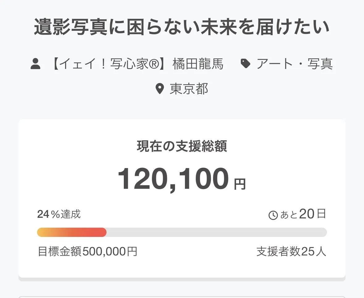 2026/03/07 07:00昨日10:00に公開したクラウドファンディングですが、初日で17名の方からご支援をいただき、目標金額の16%を達成することができました。ご支援いただいた皆さま、そしてシェアや応援の声を届けてくださった皆さま、本当にありがとうございます。このプロジェクトは、「遺影写真に困らない未来」を届けたいという想いから始まりました。歳を重ねると、人は写真を撮らなくなります。そして突然の別れの中で、遺影として使える写真が見つからない現実があります。遺影写真は、大切な人が毎朝手を合わせる一枚。だからこそ、「あとで後悔する人」をなくしたい。その想いで、東京で無料の遺影写真撮影会を開催する挑戦をしています。まだ始まったばかりですが、初日にこれだけの応援をいただけたことは本当に励みになっています。この活動を、東京から全国へ広げていきたい。その第一歩が、今回のクラウドファンディングです。もしこの想いに共感していただけましたら、シェアやお気に入り登録で応援していただけたら嬉しいです。引き続きどうぞよろしくお願いいたします。 もっと見る