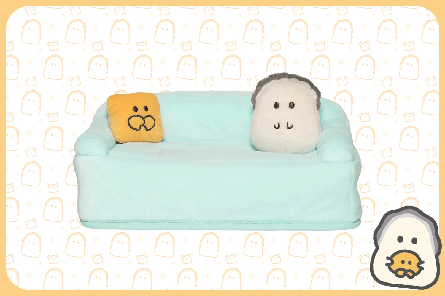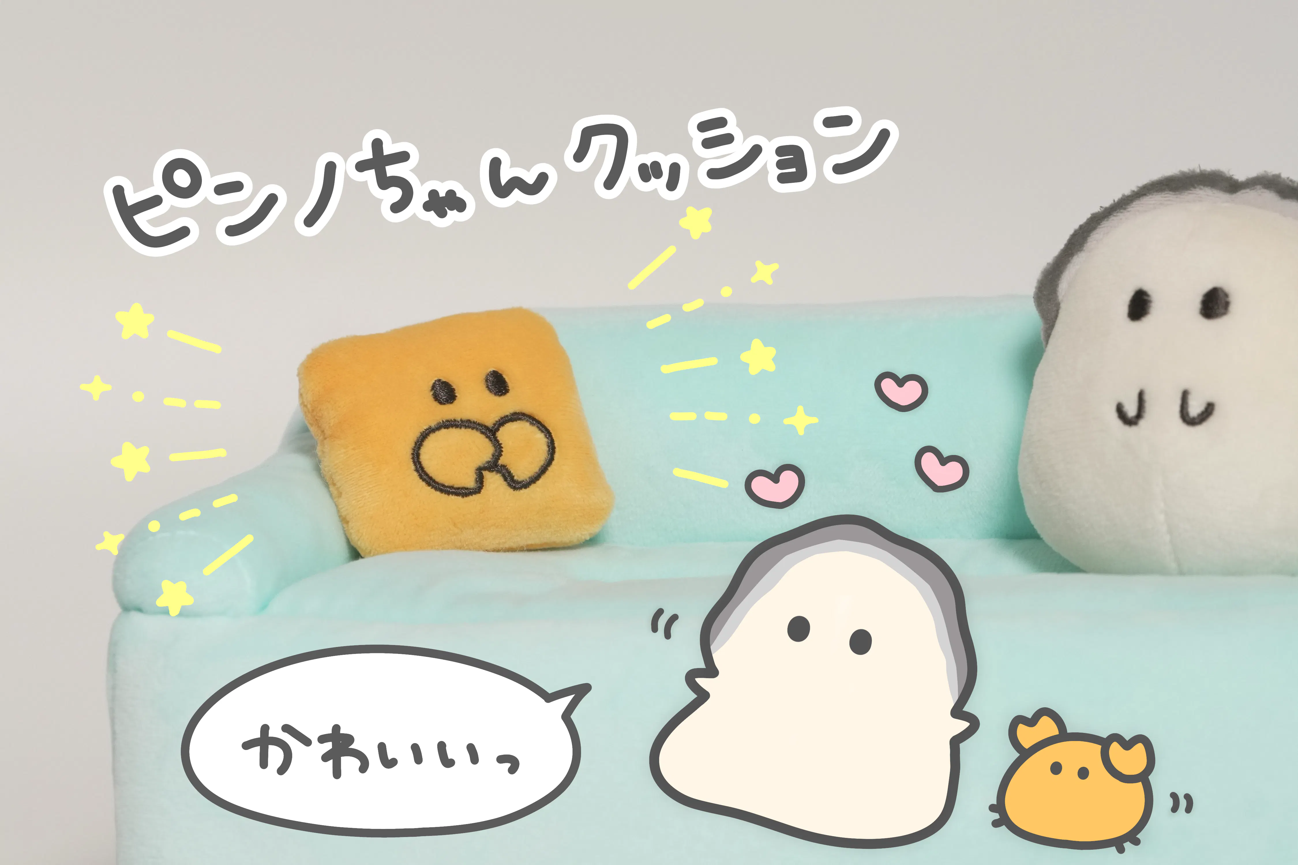ソファにちょこんと座ったぷりぷりカキとピンノちゃんが