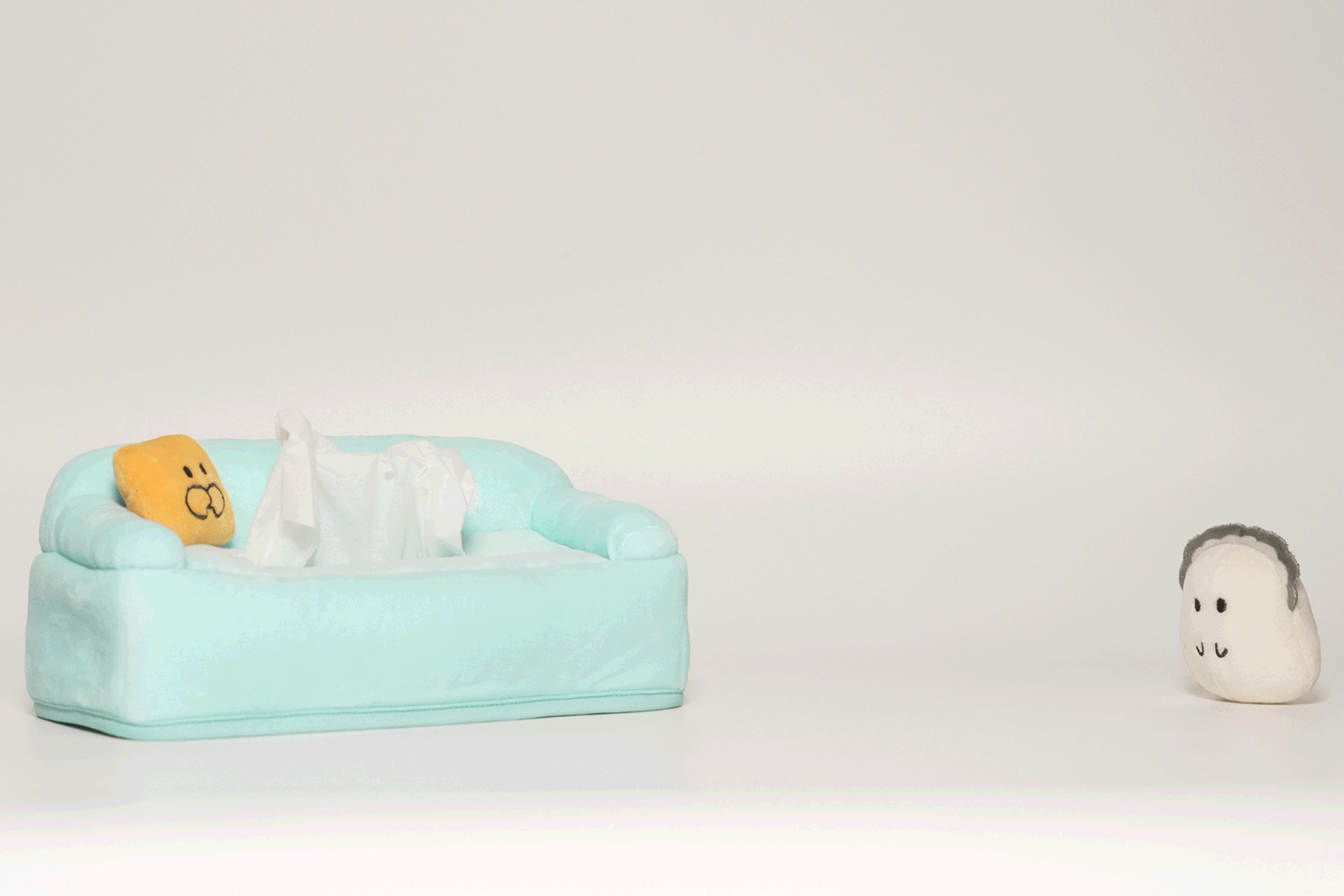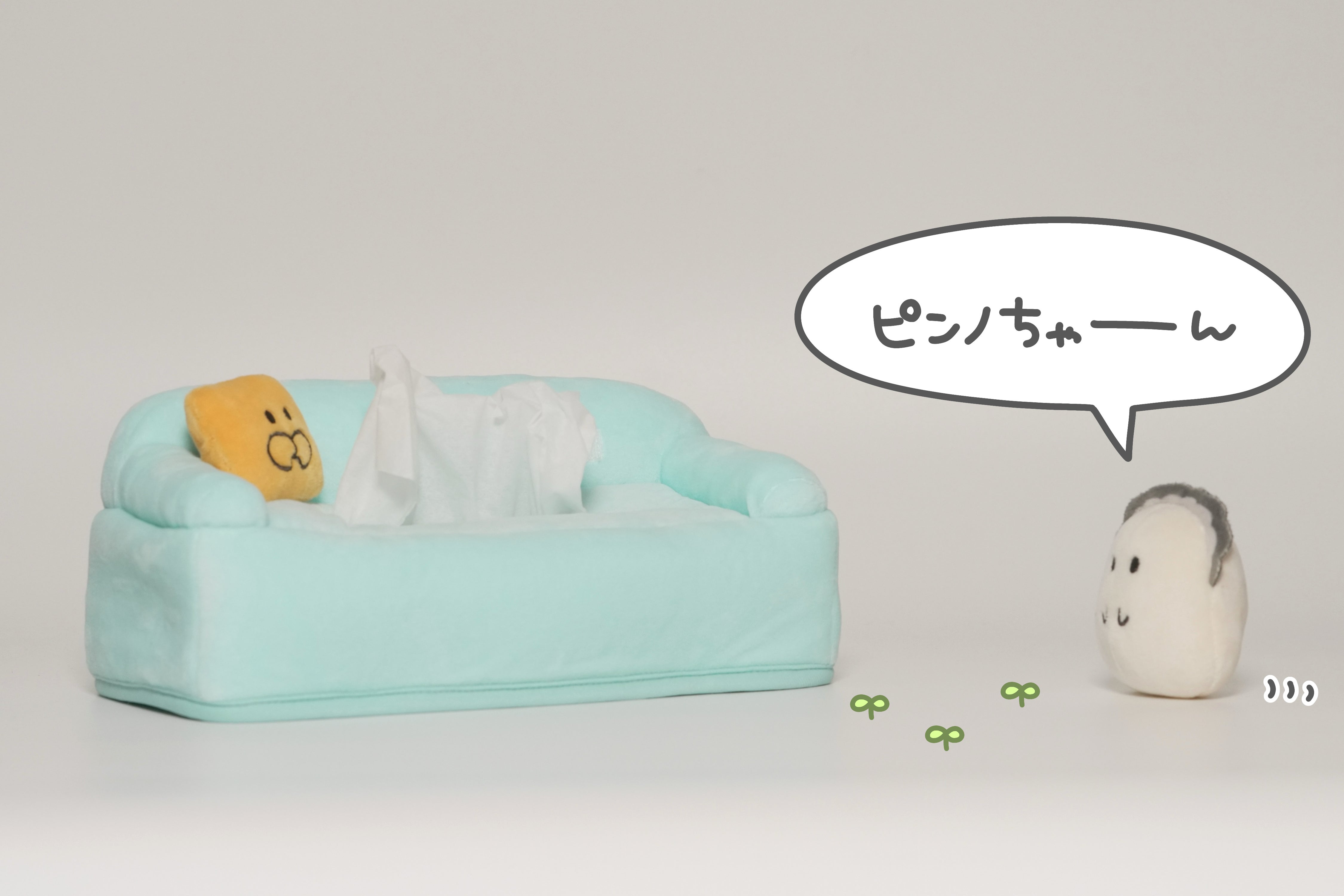 ソファにちょこんと座ったぷりぷりカキとピンノちゃんが