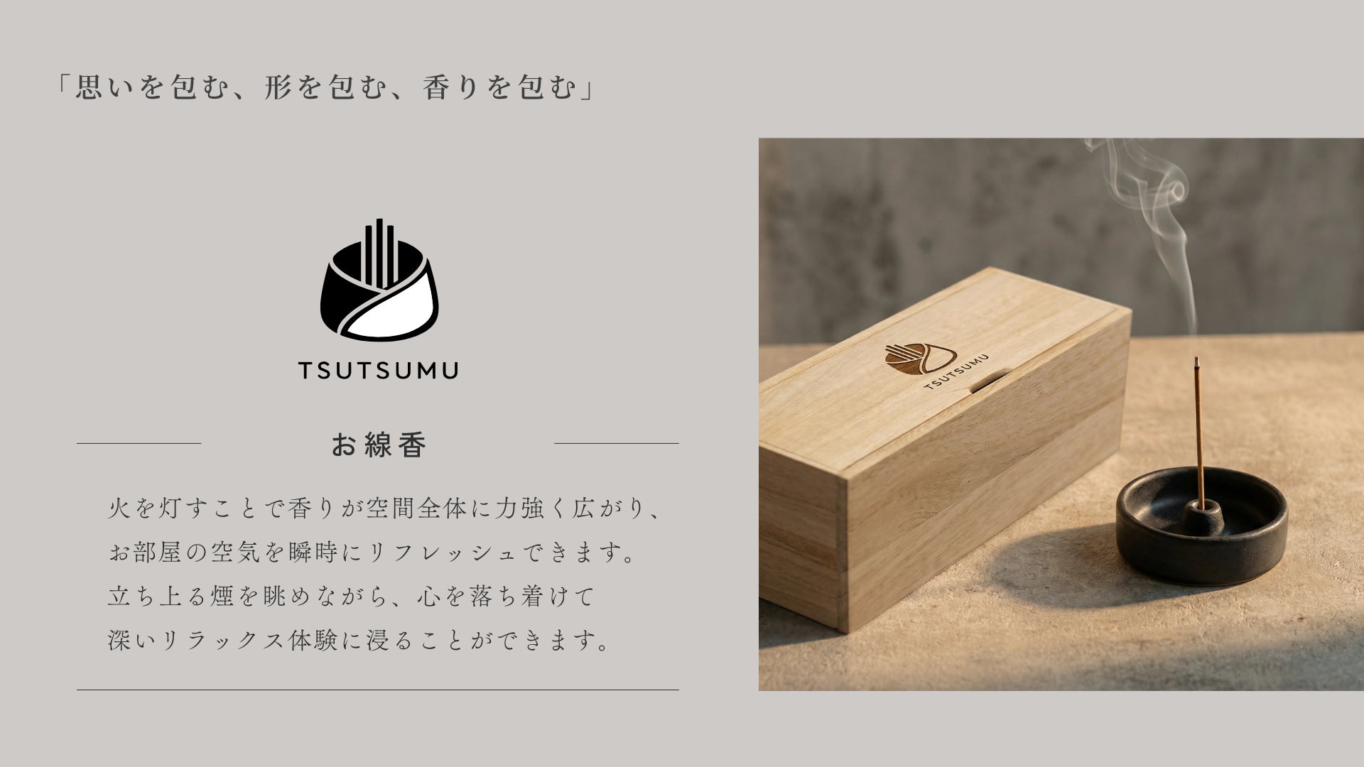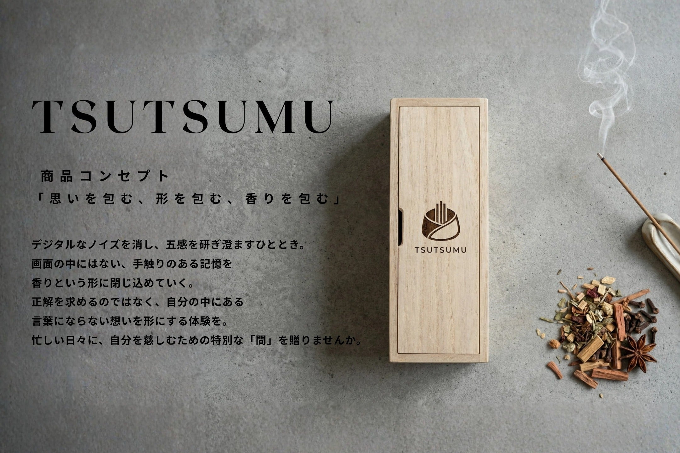 煙の揺らぎに癒やされる「お線香」と、火を使わず手軽に香りを楽しめる「匂い袋」の2種類をご用意する予定です。