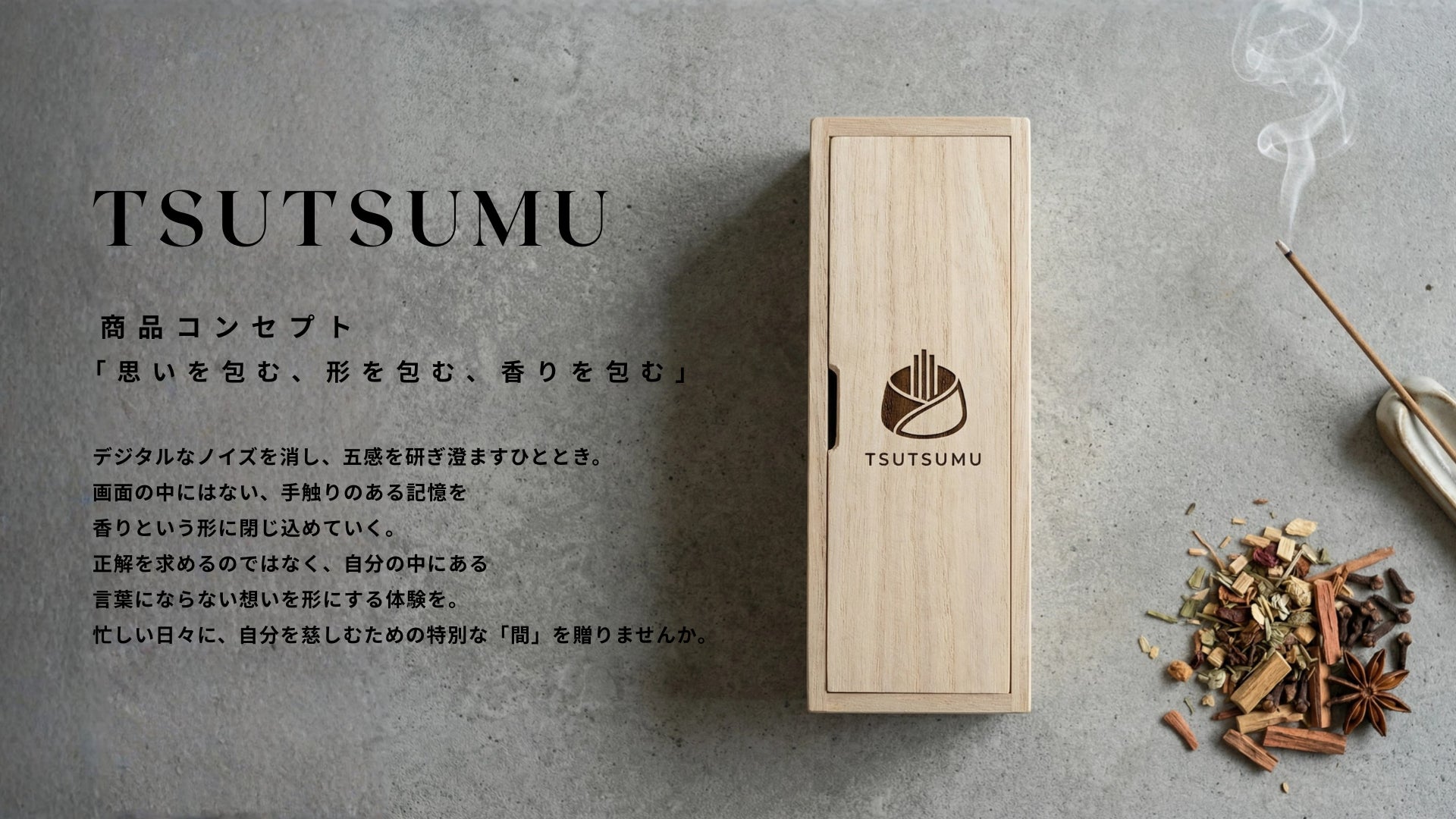 煙の揺らぎに癒やされる「お線香」と、火を使わず手軽に香りを楽しめる「匂い袋」の2種類をご用意する予定です。