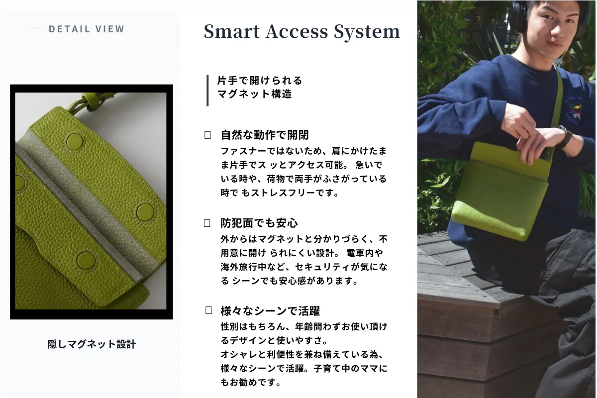 肩にかけたまま、片手でスッと開けられる構造です。
