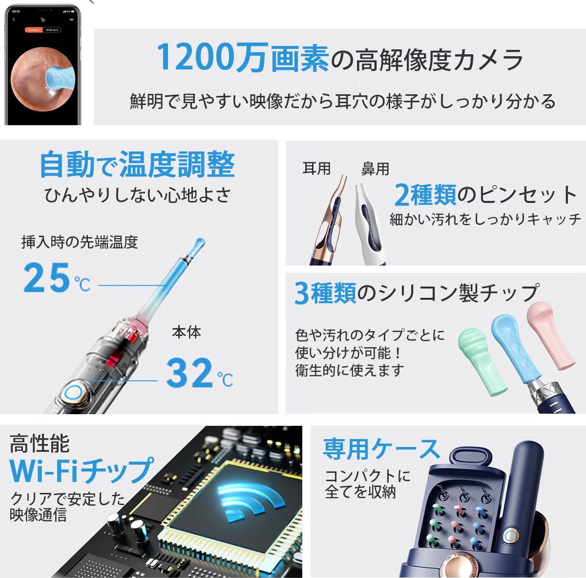 この製品の特長は、1200万画素の高解像度カメラを搭載していることにあります。耳の中の状態を鮮明に映し出し、耳垢の位置や状態をしっかり確認しながらケアできるため、無理のない操作が可能になります。さらに、安定したWi-Fi接続により映像の遅延が少なく、スムーズな操作をサポートします。先端にはやわらかいシリコンチップが採用されており、耳への負担を軽減。加えて、自動温度調整機能により、使用時の不快感を抑える設計となっています。専用ケースも付属しているため、保管や持ち運びにも便利で、衛生的に使用できる点も安心です。