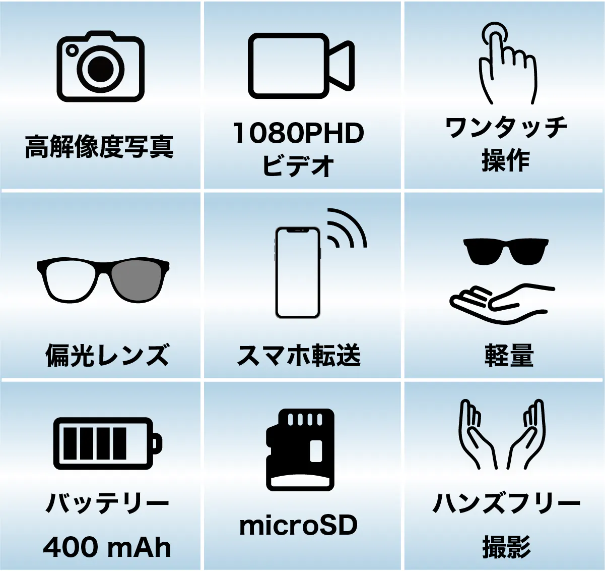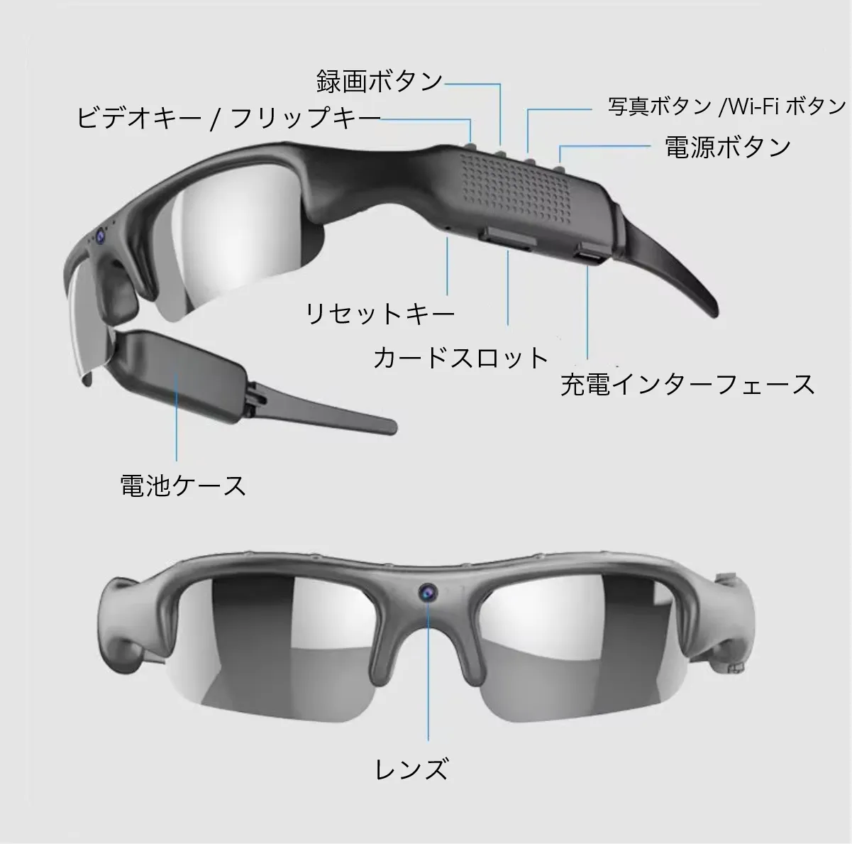 サングラスには1080P高精細カメラが内蔵されており、自分の視点からそのまま写真や動画を撮影できます。