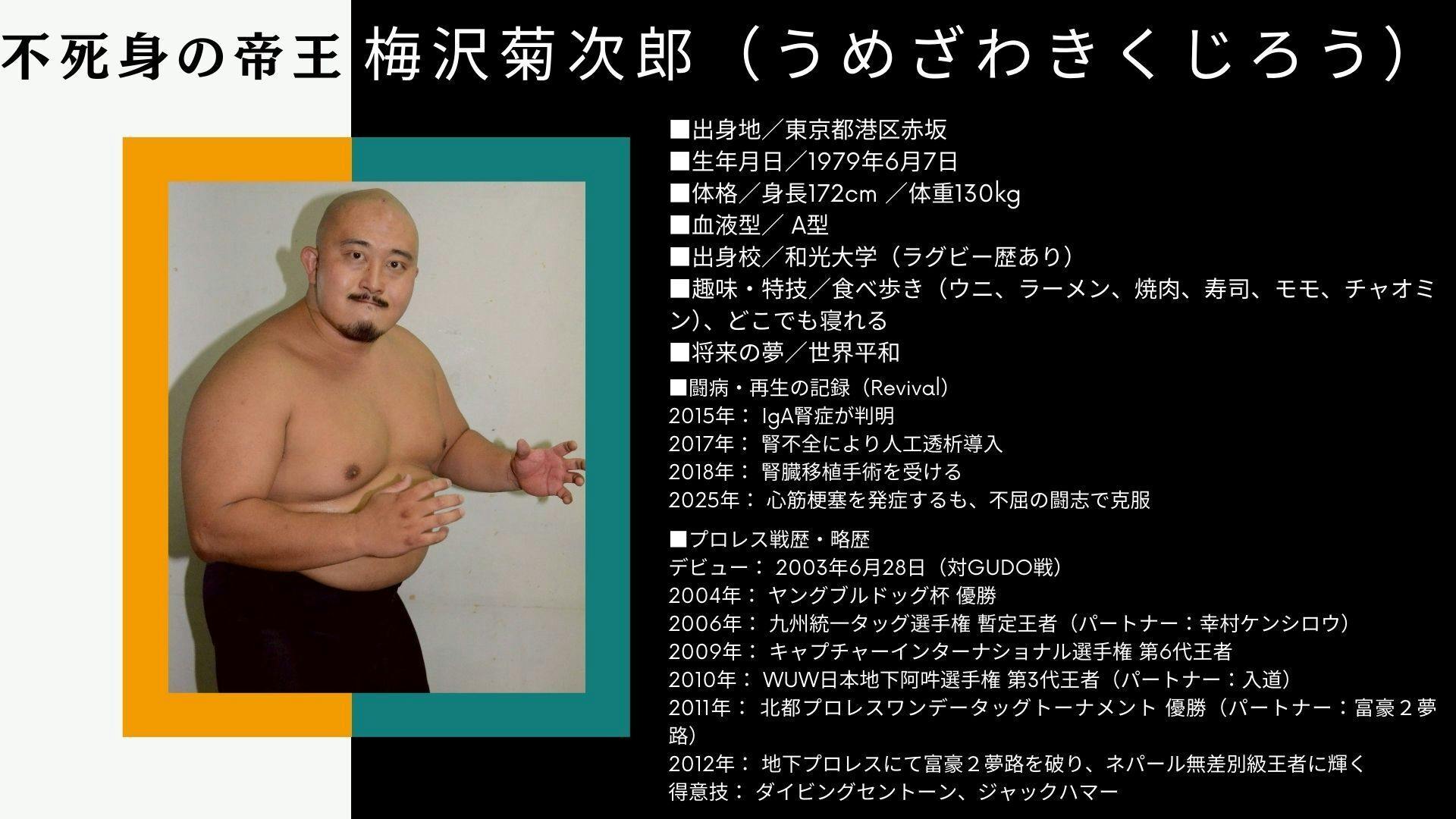不死身の帝王、梅沢菊次郎。その復活の一歩を、ぜひ会場で見届けてください。