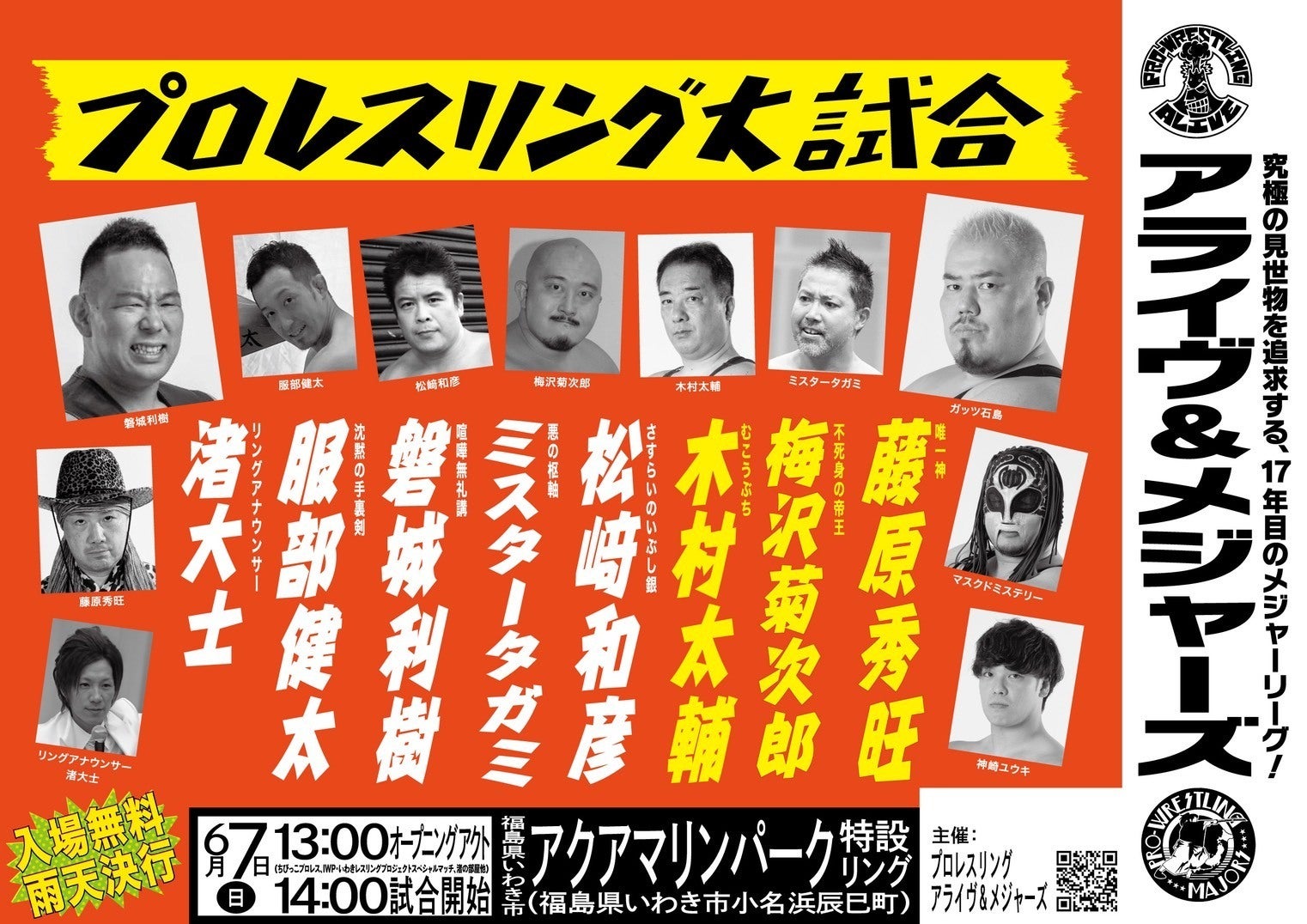 2026/04/17 08:00【ネクストゴール挑戦中】#プロレス #アライヴ#東北 で#プロレスリング #アライヴアンドメジャーズの大会を #入場無料 で開催したい!なんと100名の方ご支援いただきました。120%達成85万円突破誠にありがとうございます。プロレスリングアライヴ&メジャーズ「究極の見世物 RELOADED TOUR 2026」6月6日(土)岩手県花巻市大迫交流活性化センター(14:00)6月7日(日)福島県いわき市アクアマリンパーク特設リング(14:00)【大会情報①】6.6(土)藤原秀旺地元凱旋&梅沢菊次郎大復活戦藤原秀旺デビュー&アライヴ旗揚げの地岩手県花巻市にて入場無料大会開催正式決定!プロレスリングアライヴ&メジャーズ藤原秀旺地元凱旋スペシャル「究極の見世物 RELOADED TOUR 2026」開幕戦■日時/2026年6月6日(土) 12時50分 クラウドファンディング支援者優先入場 13時開場 13時30分イベント等開催 14:00試合開始■場所/大迫交流活性化センター(岩手県花巻市大迫町大迫第3地割161)■入場無料/入場整理券等の発行はございません。会場の規定により観客数が定員に達した場合は入場をお断りする場合がございます。ご了承ください。■お問い合わせ/プロレスリングアライヴ&メジャーズ公式サイト(https://proalive.wordpress.com/ticket/)■参戦選手/梅沢菊次郎、服部健太、ミスタータガミ、磐城利樹、藤原秀旺、木村太輔、松﨑和彦、神崎ユウキ(TTT)渚大士(リングアナ)■対戦カード/当日発表■主催/プロレスリングアライヴ&メジャーズ■その他/駐車場につきましては施設の他に市営駐車場が数カ所ございます。施設内の駐車場は満車が予想されますので、会場にて地図をお配りしご案内させていただきます。末吉利啓は公務の為欠場となります。TTT神崎ユウキの参戦が決定いたしました。【大会情報②】6.7(日)アライヴ&メジャーズ福島初進出!磐城利樹の地元、福島県いわき市アクアマリンパークにて入場無料大会開催正式決定!アライヴ&メジャーズ対インディー統一連合TTT全面激突戦、超激化!プロレスリングアライヴ&メジャーズ磐城利樹地元凱旋スペシャル「究極の見世物 RELOADED TOUR 2026」第二戦■日時/2026年6月7日(日)13:00 オープニングアクトちびっこプロレス、IWP(いわきレスリングプロジェクト)スペシャルマッチ、渚の部屋他14:00試合開始■場所/アクアマリンパーク特設リング(福島県いわき市小名浜辰巳町)■入場無料/入場整理券等の発行はございません。■お問い合わせ/プロレスリングアライヴ&メジャーズ公式サイト(https://proalive.wordpress.com/ticket/)■参戦選手/梅沢菊次郎、末吉利啓、服部健太、ミスタータガミ、磐城利樹、藤原秀旺、木村太輔、松﨑和彦、ガッツ石島(TTT)、マスクドミステリー(TTT)、神崎ユウキ(TTT)、渚大士(リングアナ)■対戦カード/近日発表■主催/プロレスリングアライヴ&メジャーズ■その他/お車でお越しの際は、近隣の駐車場をご利用ください。末吉利啓は公務の為欠場となります。 もっと見る梅沢菊次郎よりメッセージ