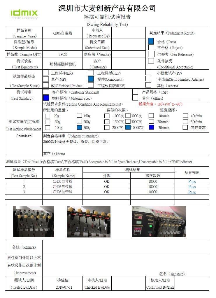 IDMIX社から工場で実施している線材の強度試験についてデータを入手しました。300gの重りを吊るして180°(+90~-90°)に振る(揺らす)というものです。仕様的には3000回の時点で破裂、損傷が無ければ問題ないと判断できるのですが、IDMIX社の方針で10000回まで実施され、その時点でも損傷が発生しない事を確認する仕様にしています。内蔵ケーブルの強度について心配するご意見を何件か頂いたので、参考に投稿させて頂きます。
