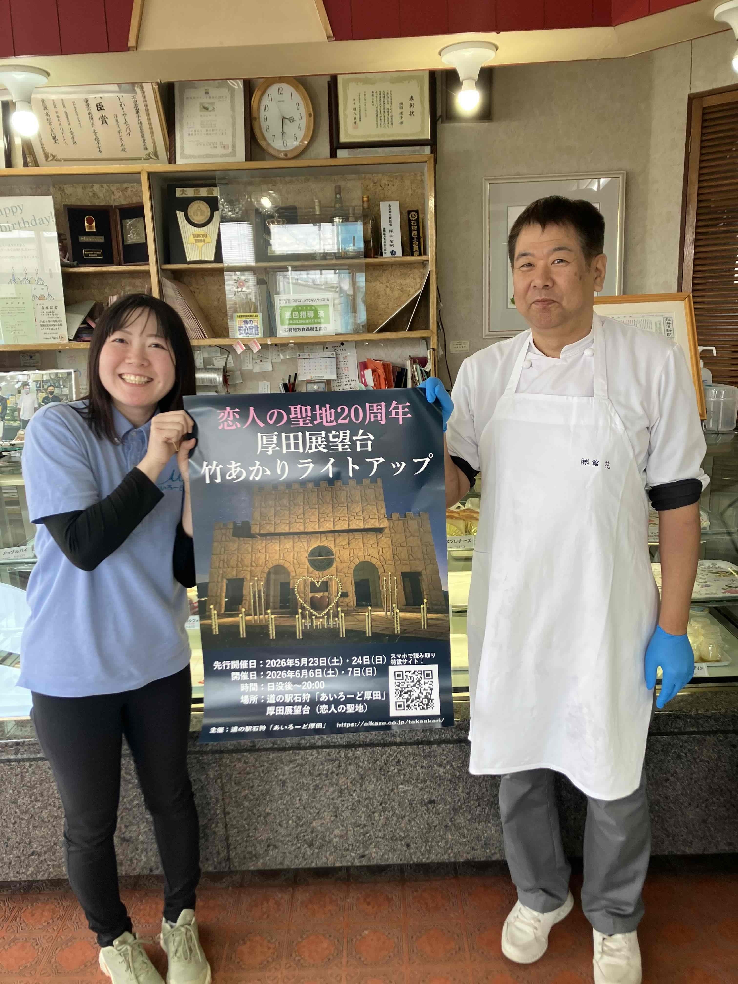 皆さまに温かく受け取っていただき、広報に向けた準備が大きく前進した一日となりました。ボンヌール洋菓子店さんにご挨拶に行き、ポスターをお渡ししました。道の駅でも販売している、ラブR231は恋人の聖地認定時に作成した商品だということを伺いました。
