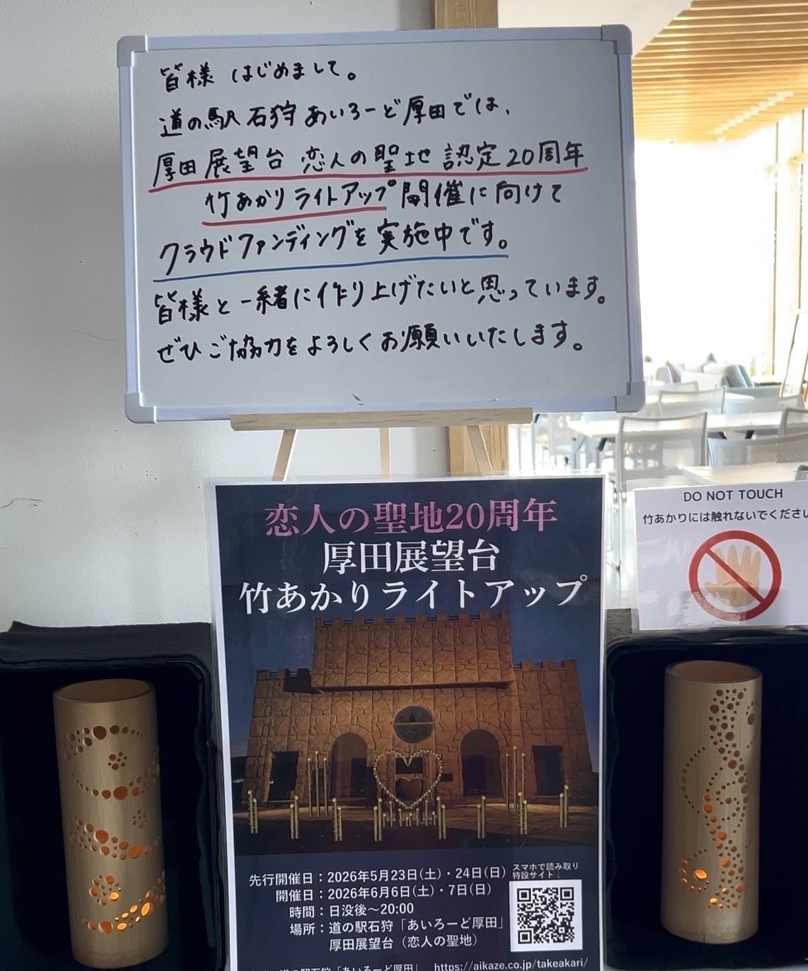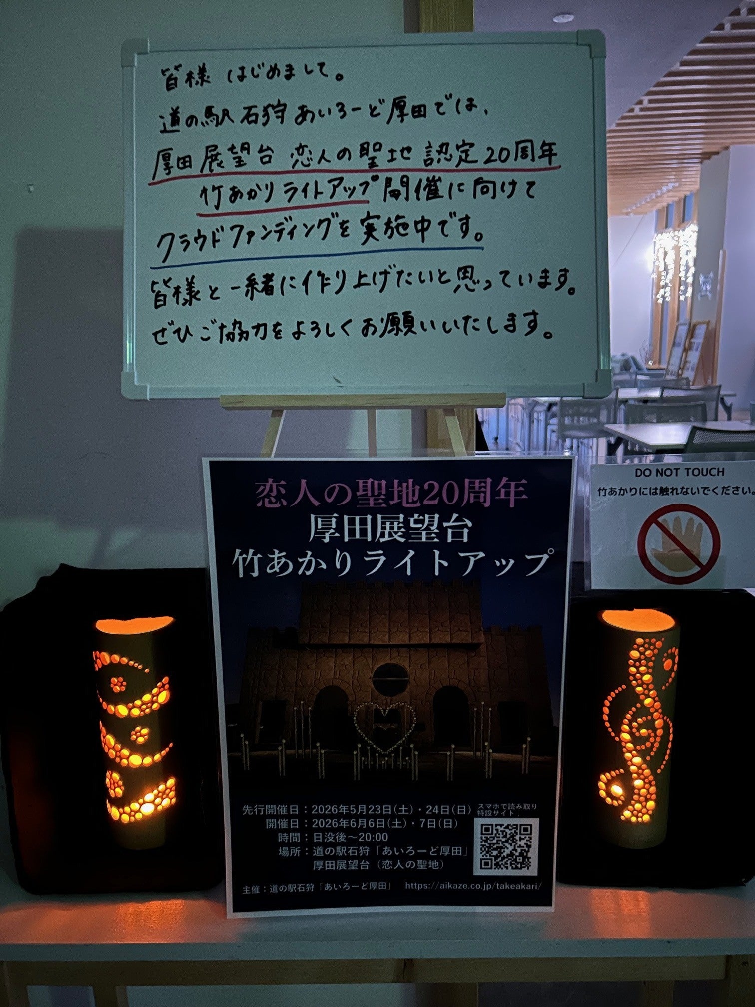 そして、道の駅の2階では、今回デザイン等を依頼しています、CHIKAKEN様の公式サイトより購入しました、竹あかりの実物とポスターを使った小さな展示も始めました。 あたたかい光に足を止めてくださる方もいて、 実際に見てもらえる場ができたことをとても嬉しく感じています。