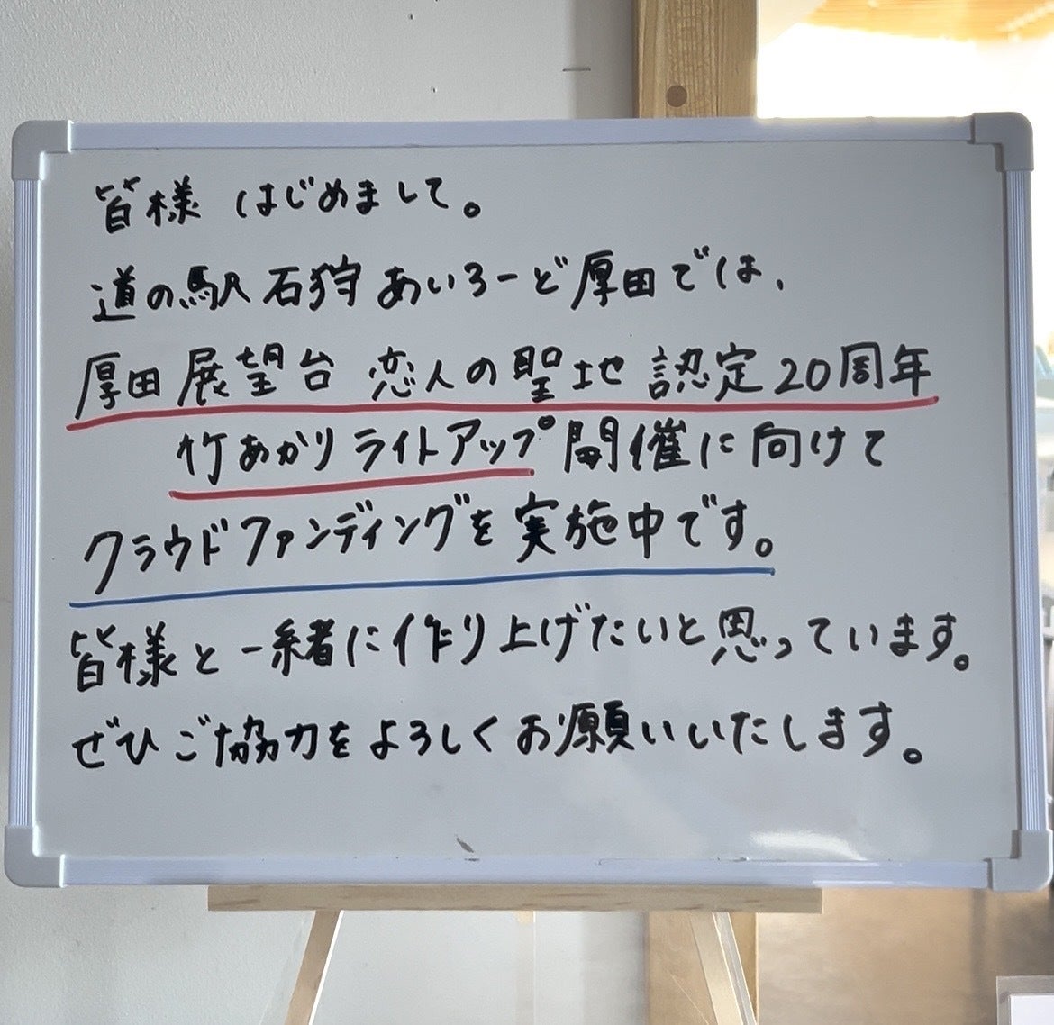 2026/04/01 12:00昨日でクラウドファンディングの残り日数が20日を切り、 いよいよ後半戦に入りました。ここまで応援してくださった皆さまのおかげで、 地域の中でも少しずつ「竹あかり」の存在が広がり始めているのではないかと実感しています。ご支援、ご協力いただいている皆様、本当にありがとうございます。3月末に完成したポスターを持って、少しずつ地域の皆さまへご挨拶に伺ってきました。 市役所、商工会、厚田支所、地域のカフェ、そして道の駅の取引先など、 一つひとつ丁寧に回る中で「楽しみにしているよ」「うちにも貼っていいよ」と 温かい言葉をいただくことが増え、活動の励みになっています。4月に入り、さらに多くの場所へ足を運びたいと思い、 地域のお店、施設などにもご挨拶を広げていく予定です。 そして、道の駅の2階では、今回デザイン等を依頼しています、CHIKAKEN様の公式サイトより購入しました、竹あかりの実物とポスターを使った小さな展示も始めました。 あたたかい光に足を止めてくださる方もいて、 実際に見てもらえる場ができたことをとても嬉しく感じています。クラウドファンディング後半戦、最後まで丁寧に、そして楽しく動いていきます。 引き続き応援をよろしくお願いいたします。 もっと見る