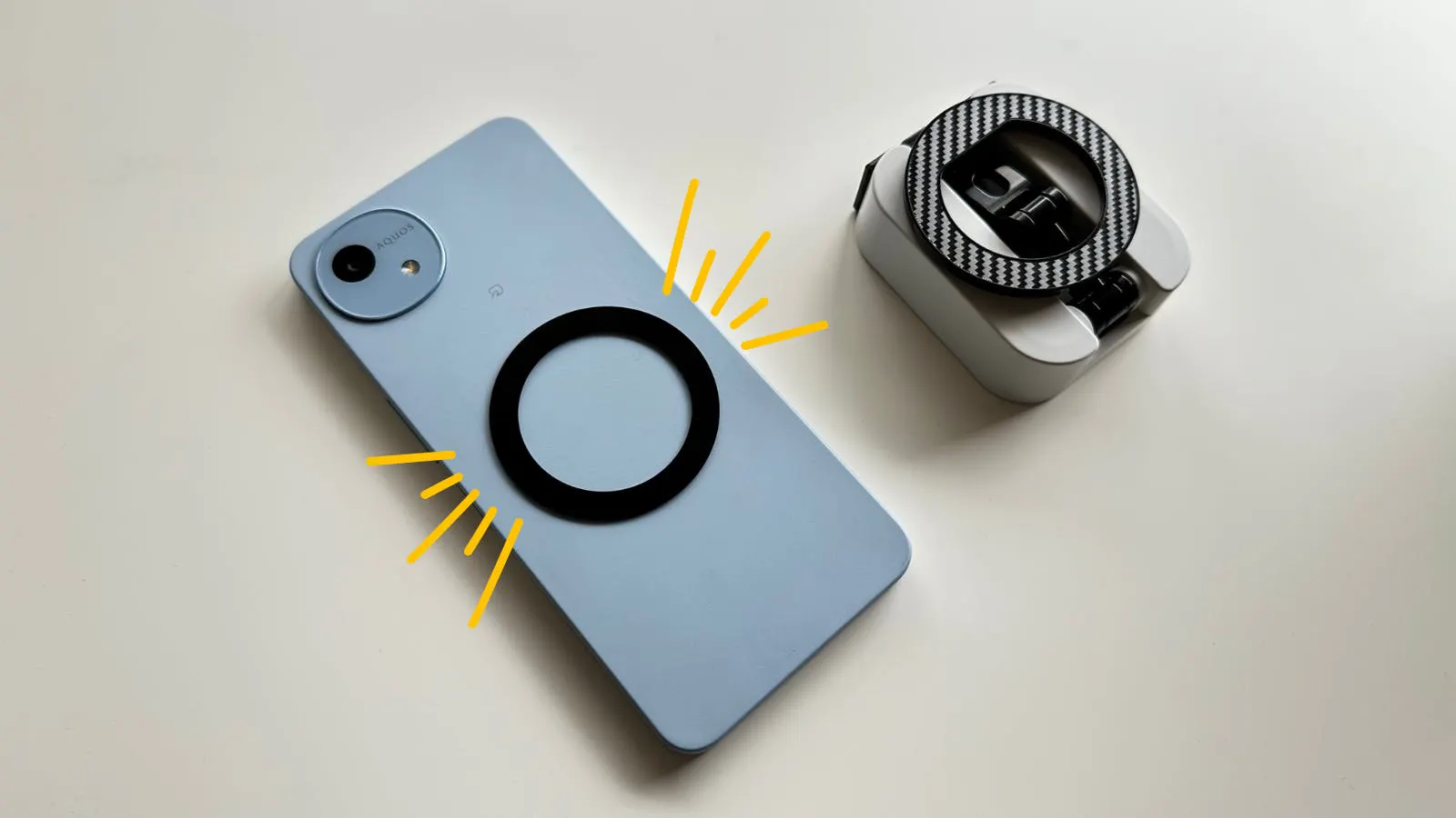 MagSafe非対応のスマホでも、付属のメタルリングを使えばしっかり固定可能。