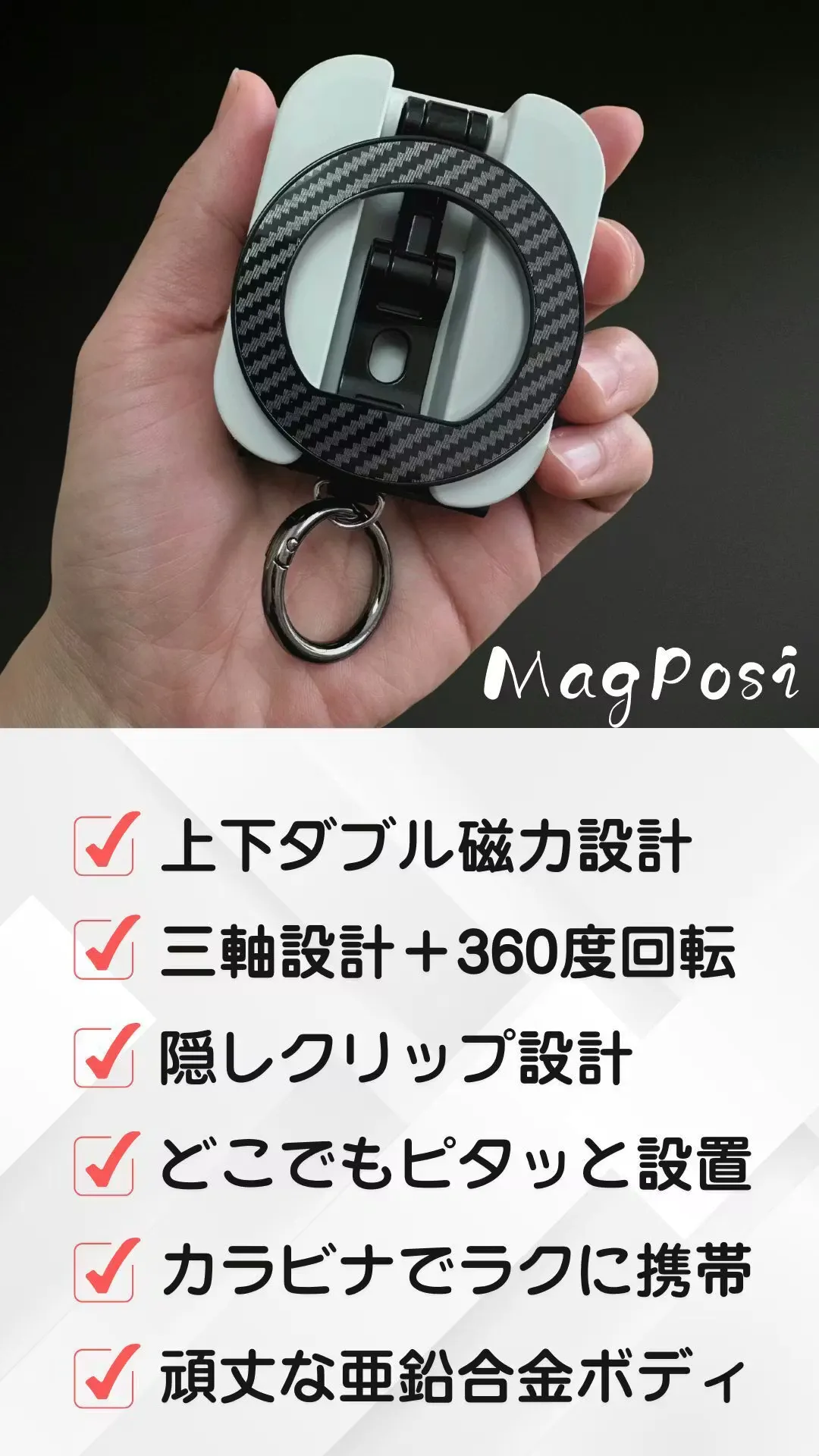 「MagPosi」は、スマホの設置や角度調整の悩みを解消する多機能スタンド。ダブルマグネットで安定固定、隠しクリップで設置自由。三軸構造で角度も自在、持ち運びにも便利です。