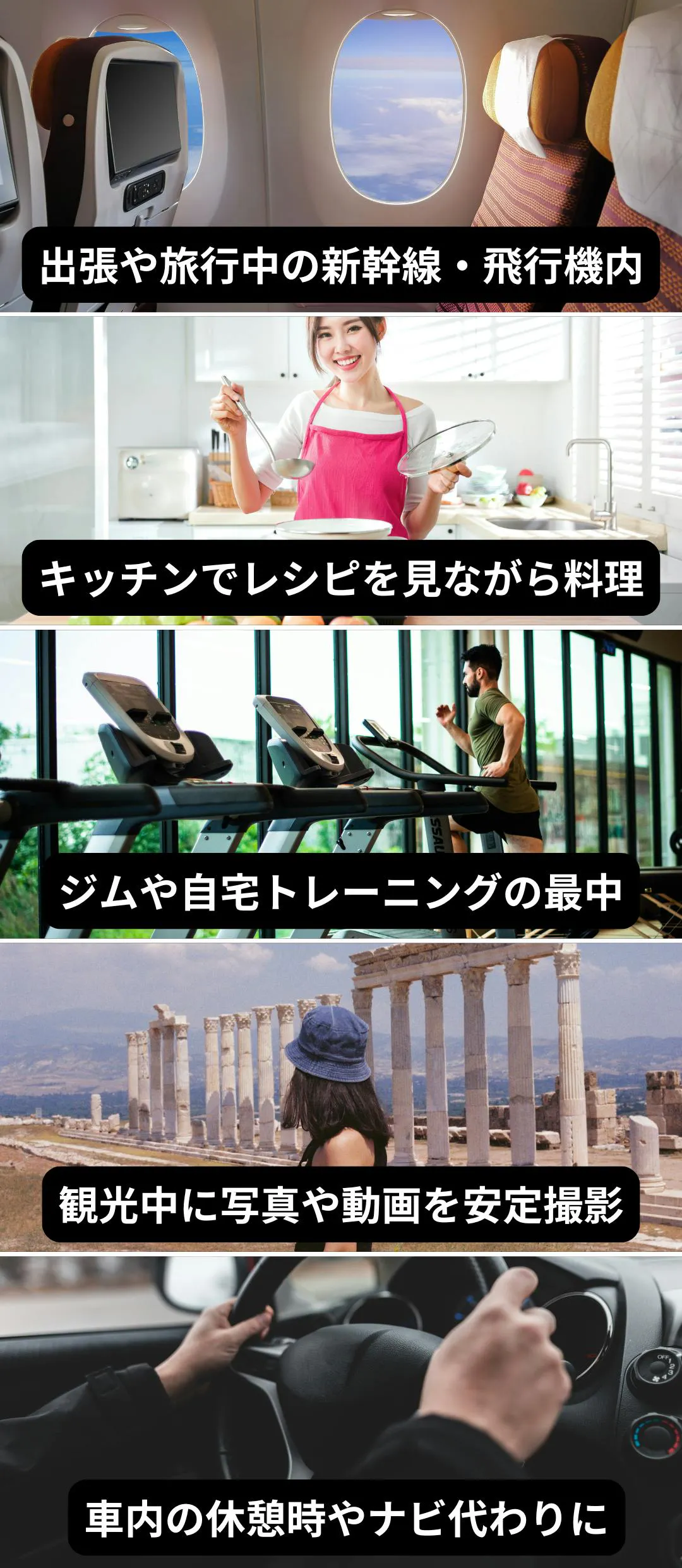 おうちでの動画視聴、キッチンでのレシピチェック、外出先での撮影や通話など、使い方はいろいろ。場所もシーンも選ばず、“こんな時にあったらいいな”を叶えてくれる便利スタンドです。