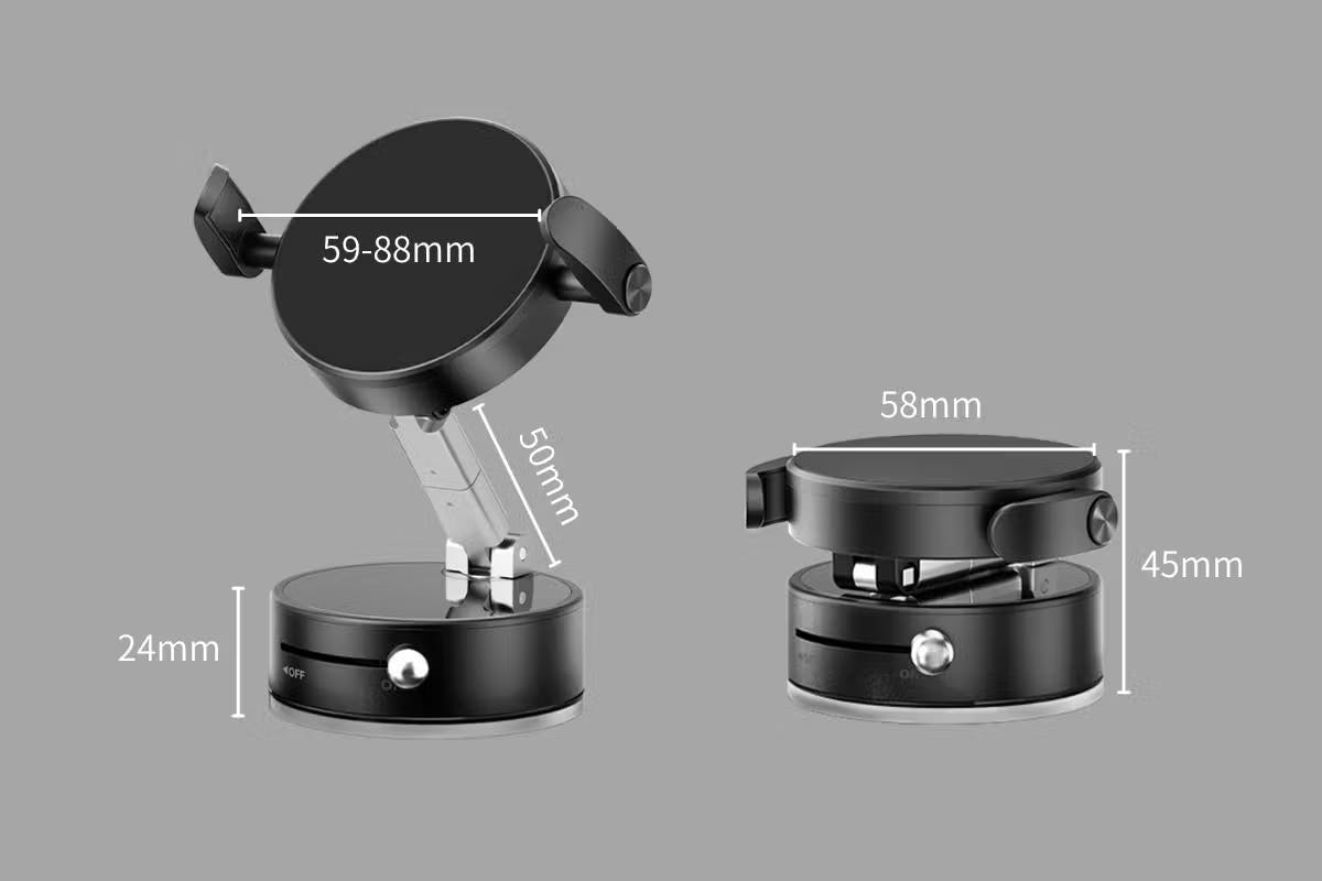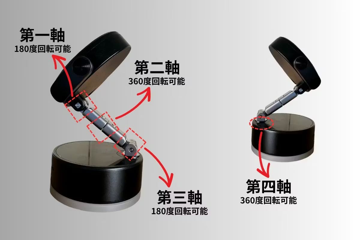 真空吸着・マグネット・伸縮アーム・4軸調整を備え、スマホのサイズや設置場所を問わず、安定した固定と自由な角度調整が可能になります。