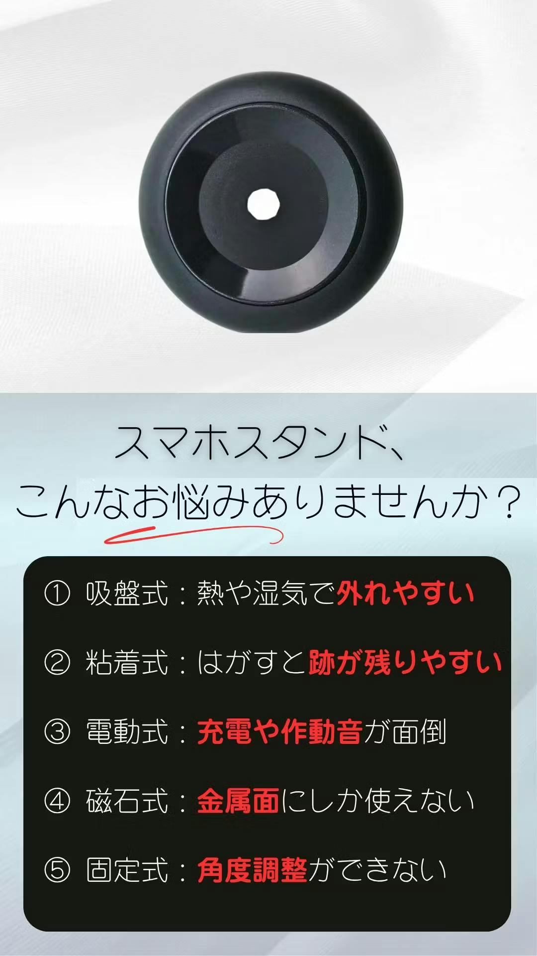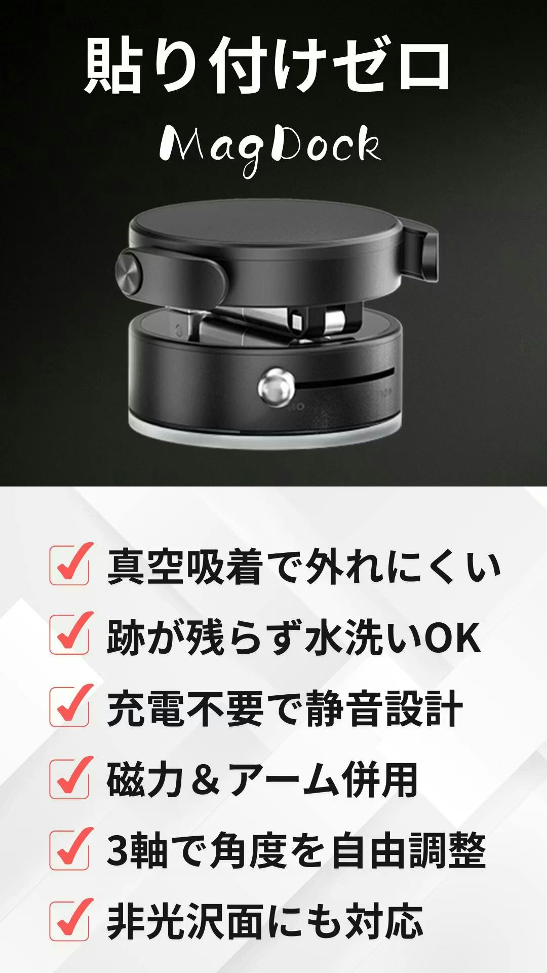MagDockがあれば、「吸盤が外れる」「粘着が残る」「充電や音が気になる」「角度が変えられない」「金属面にしか使えない」といったスタンドの悩みをすべて解決。