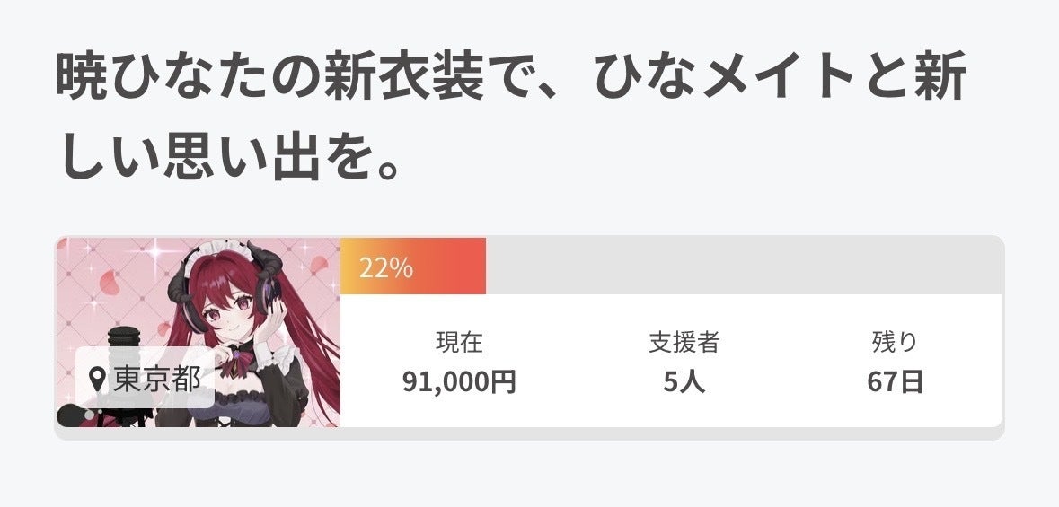 • ╭━━━━━━━━━╮    こんひなっ╰━v━━━━━━━╯暁ひなたです。クラファン開始から約2週間が経ちました。現在22%のご支援をいただいており, 感謝の気持ちでいっぱいです。本当にありがとうございます。...でも!クラファンの世界は甘くない...!!達成までの残り80%を, あと2ヶ月と1週間で成し遂げなければなりません。現在Xを中心に宣伝活動を行っていますが, 中にはXをやっていない方もいらっしゃると思うのでこちらで書かせていただいております。この投稿でひなたを知ってくださった方にも興味を持っていただければと思いながら綴っています。何度でも書きます。どうしても新衣装を皆様と一緒に作り上げたいです。その為には1人でも多くのご支援や拡散力が必要となります。どうか暁ひなたを助け...いや, 一緒にこの春を走り抜けてはいただけないでしょうか?そして, 既にご支援いただいている支援者様には返礼品がございますので, メッセージからお気軽にお問合せください。通話券のご利用は3月からでも可能となっております。通話券の放棄などもあればメッセージで教えていただければと思います。それでは, 引き続きよろしくお願いいたします...! もっと見る