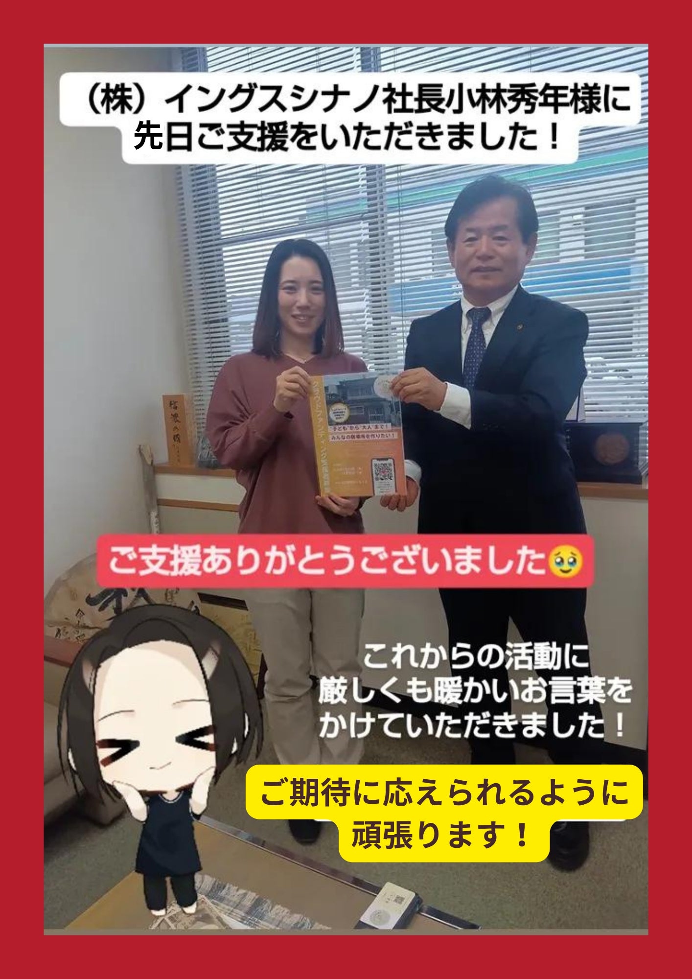 • こんにちは!みんなの居場所ふらっとです。改修工事は着々と進んでいます。今日はご支援いただいた方のご紹介第2弾です。株式会社イングスシナノの社長であり、下諏訪商工会議所会頭でもある小林秀年様。かくいう私も下諏訪商工会議所会員ですが、面と向かって話をさせていただくのは初めてでした。ふらっとの活動やこれからのことについて親身になって聞いてくださり、厳しくも優しいお言葉をかけていただきました。ご支援についてもその場で即決!w後日改めて・・・と思っていた私はポカーンwww戸惑いながらもありがたく受け取らせていただきました。ご支援いただき、本当にありがとうございました! もっと見る