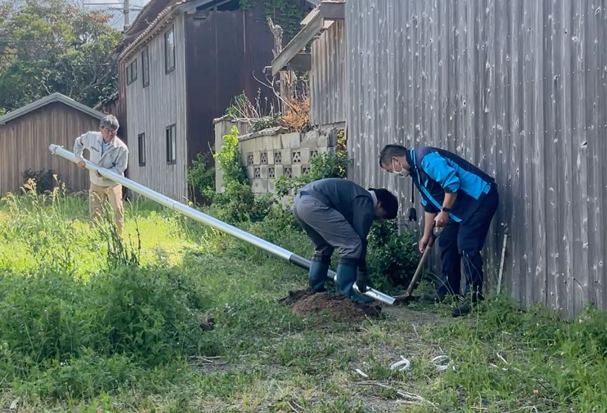 上の写真は近くの通りから電気を引いてくるために必要な電柱設置の様子。施工管理の担当者さんが穴掘り作業を手伝っています。本来ならそういう役割の人じゃないのに、
