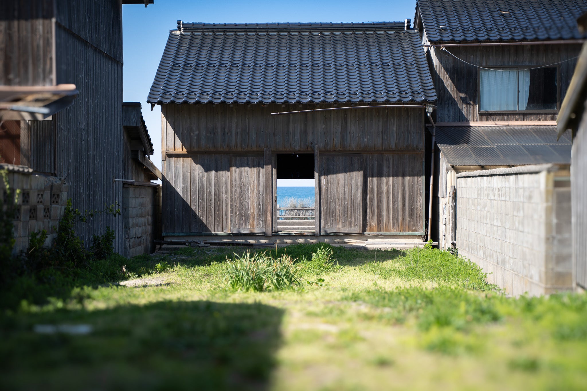 鳥取県琴浦町・八橋海岸。潮風にさらされ、グレーに褪せた外壁の小屋。かつては酒蔵の馬車小屋として、街に活気を運んでいた場所です。