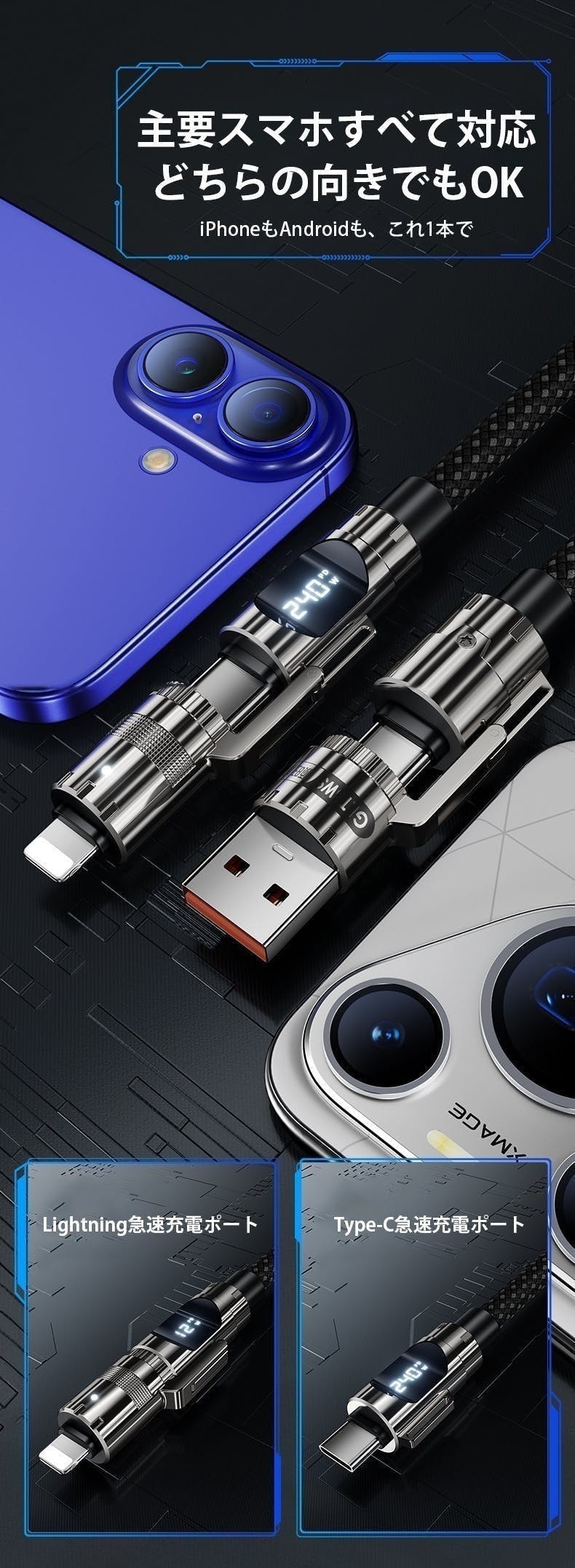本製品は4種類の端子を1本に集約しているため、スマホ・ノートPC・タブレット・ゲーム機まであらゆるデバイスをこれ1本で充電でき、複数のケーブルを持ち歩く手間から解放されます。