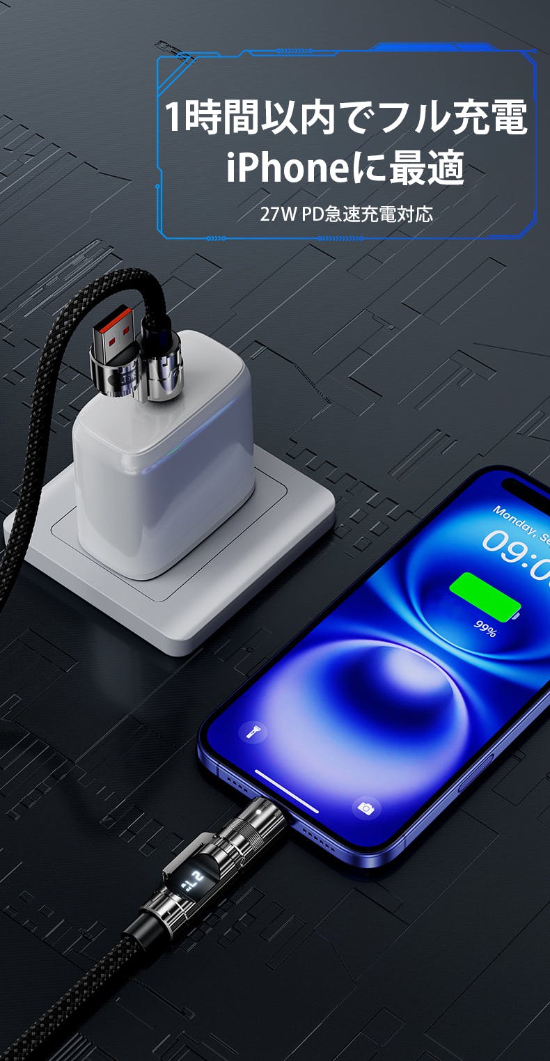 太い純銅ケーブルを採用しているため、電力伝達効率が高く発熱を抑えられる上、長期間の使用でも劣化しにくく、常に安定した充電性能を発揮します。