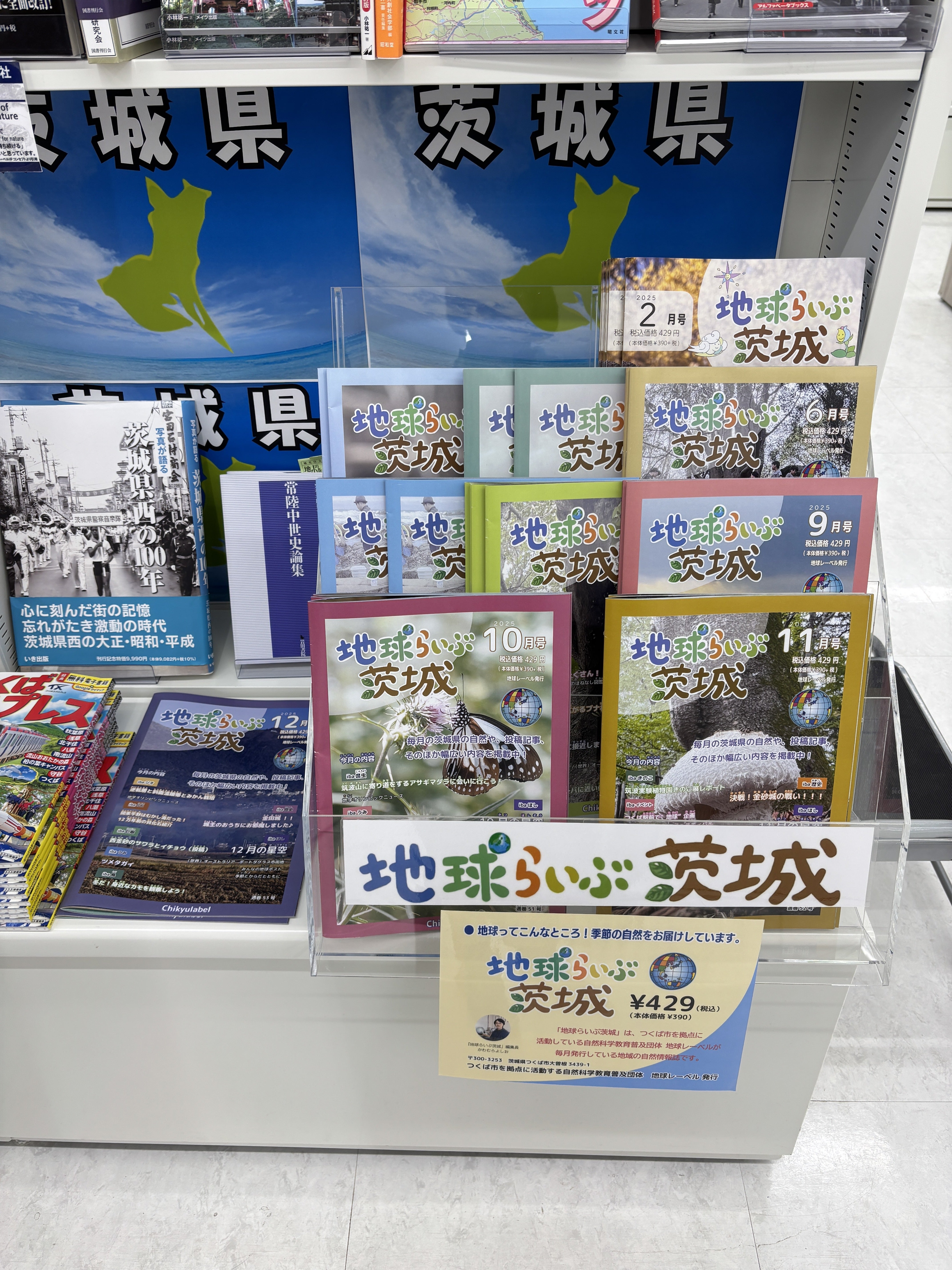 土浦市の公立の小中学校の他、茨城県立図書館、つくば市立図書館、筑西市中央図書館、土浦市立図書館など50ヶ所ほどに毎月無償にて「地球らいぶ・茨城」を配架させていただきました。