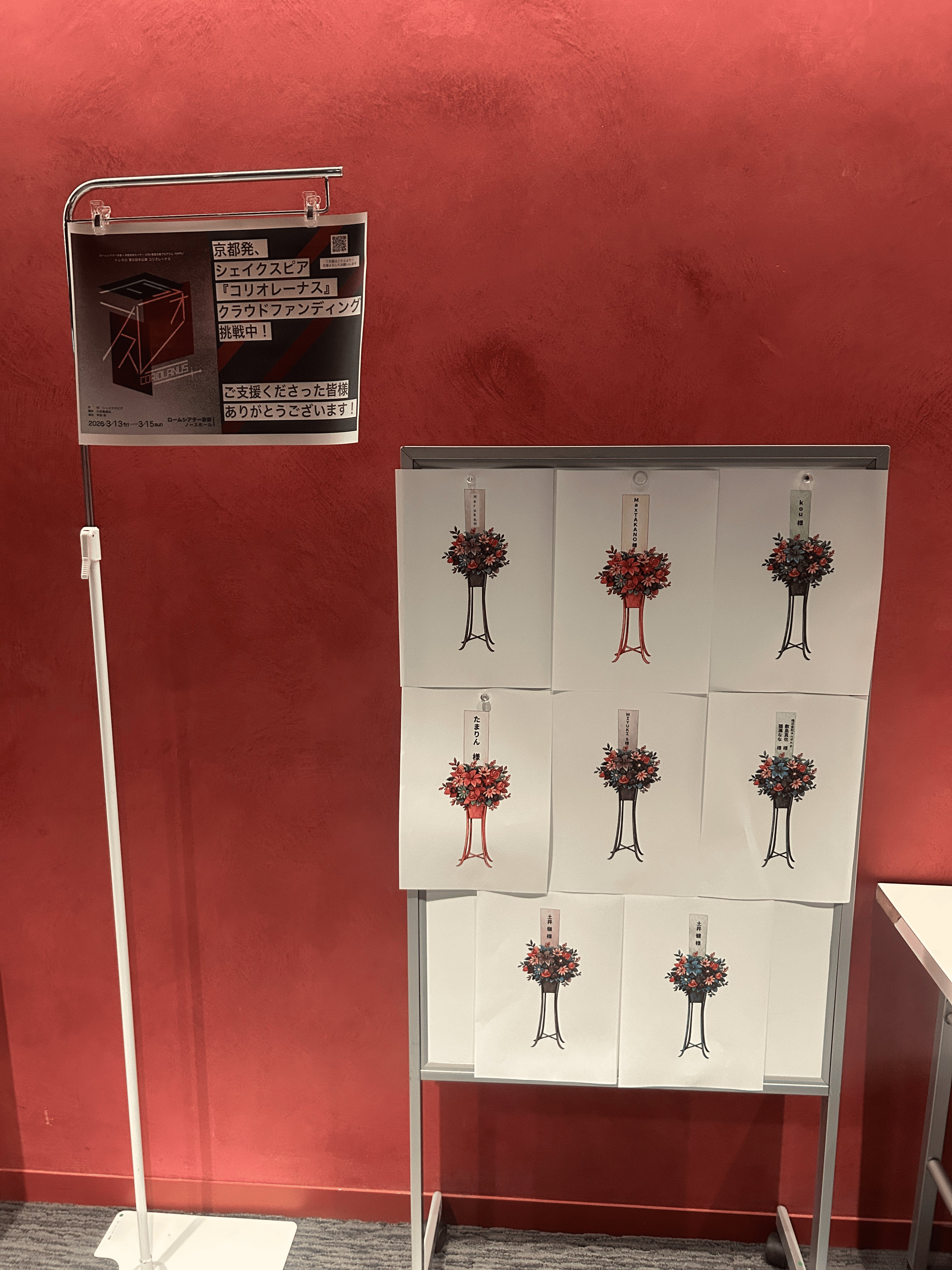 2026/03/17 18:00トレモロ『コリオレーナス』の公演にご支援いただきました皆様、気に変えてくださった皆様、誠にありがとうございます。この度、トレモロ『コリオレーナス』はロームシアター京都にて上演を迎えることができました!受付にて、クラウドファンディングのご支援者様のお名前(ニックネーム)掲示をさせていただきました!(お名前掲載のリターンを含んだプランのご希望者様が対象です)お祝い花をイメージしたデザインで作成させていただきました!クラウドファンディングをご支援くださった皆様のお気持ちが大変励みになり、上演を行うことができました。これまでにご支援いただきました皆様に心から、感謝申し上げます。 もっと見る