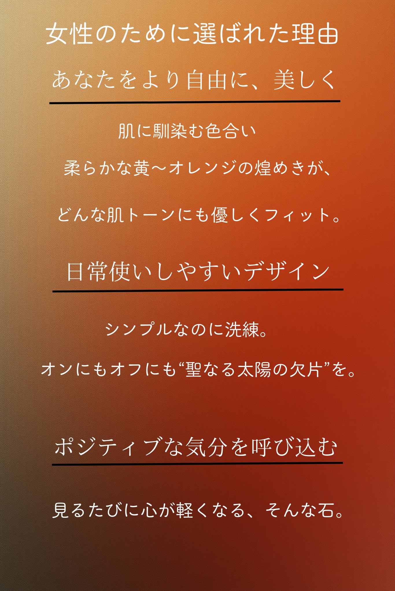 柔らかな太陽のような輝きは、主張しすぎることなく、日常の装いにも自然に溶け込みます。