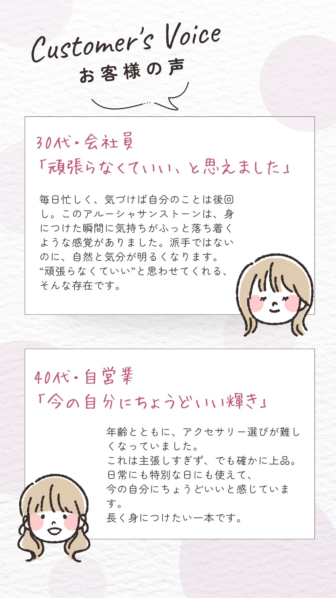 はい。アルーシャサンストーンは、年齢やライフステージを問わず自然に馴染む、やさしい輝きが特徴です。20代から50代以上の方まで、幅広くお使いいただけます。