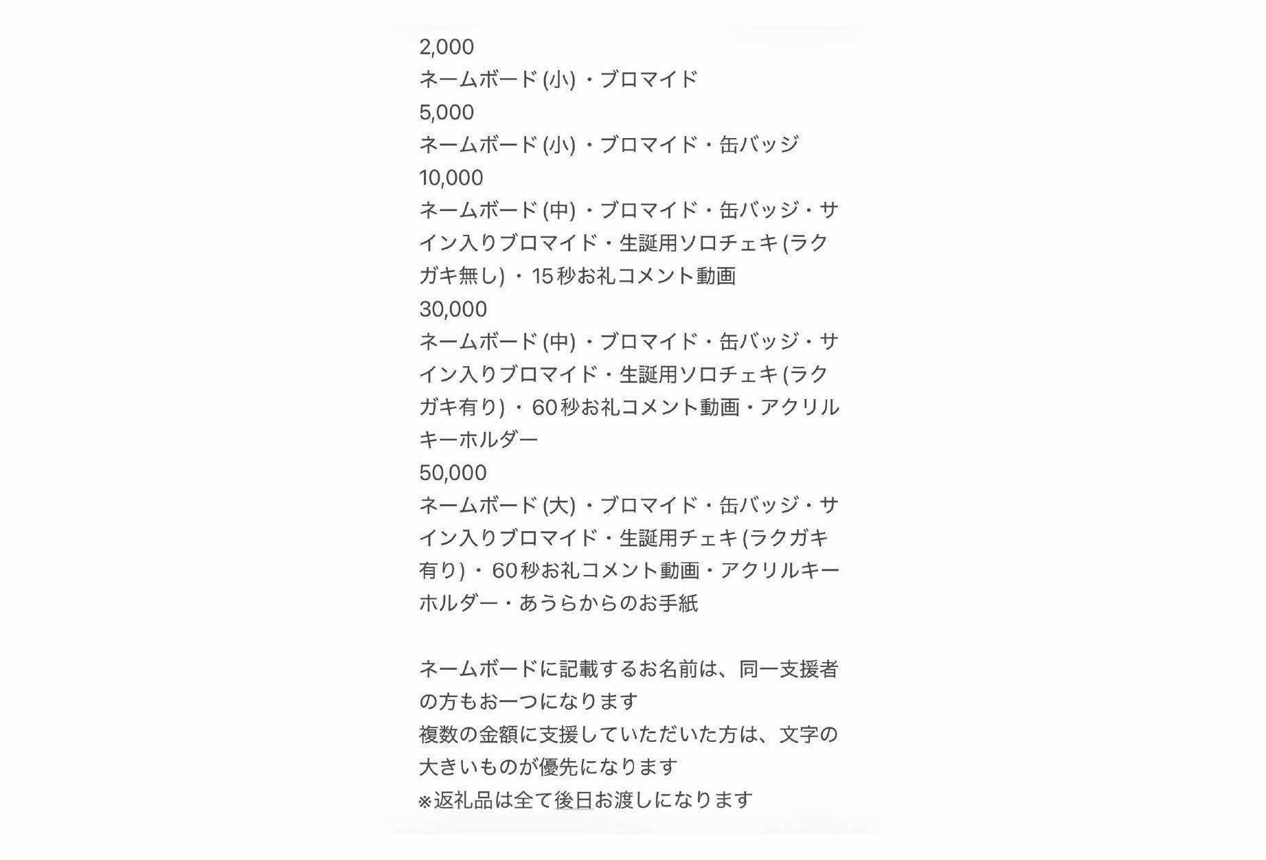 ネームボードにお名前記載(大文字)・ブロマイド・缶バッジ・サイン入りブロマイド・生誕用ソロチェキ(ラクガキ有り)・60秒お礼コメント動画・アクリルキーホルダー・あうらからのお手紙