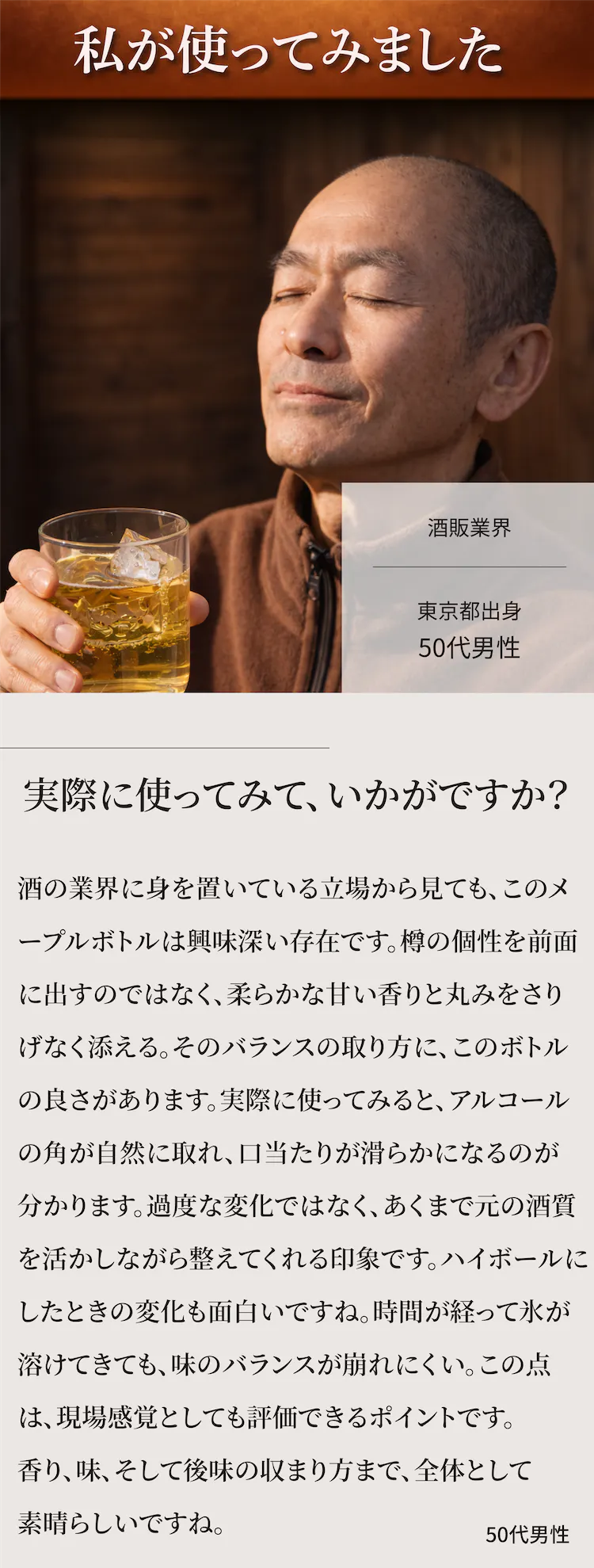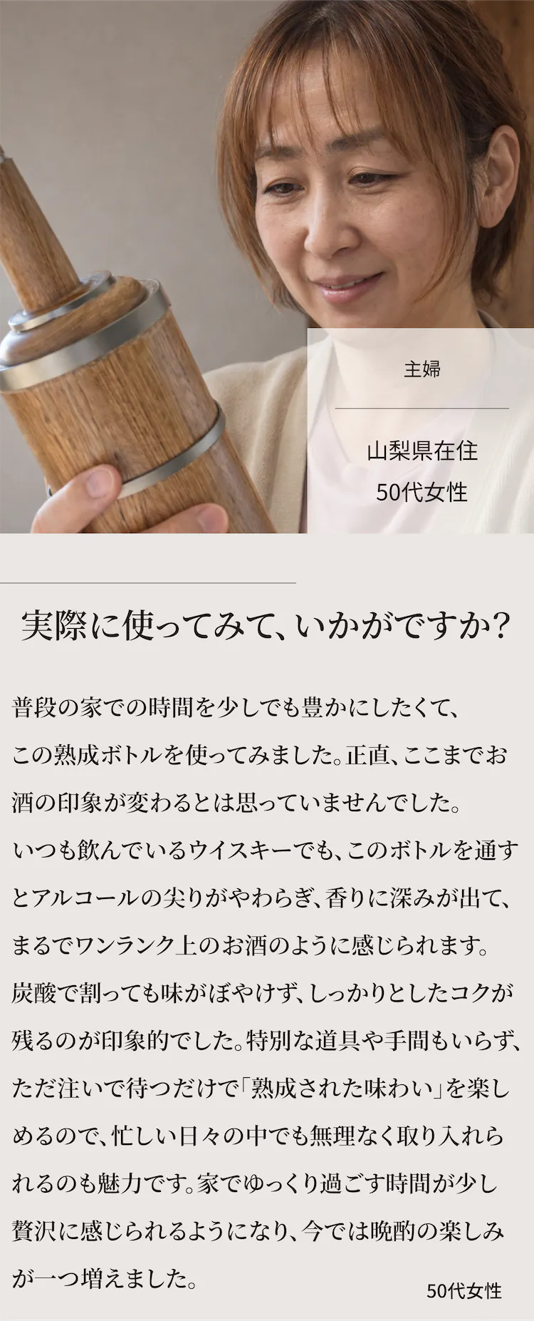 A:安いいつものウイスキーでもワンランク上の味わいになります。バーで熟成酒を飲むより圧倒的にコスパ良く楽しめます。