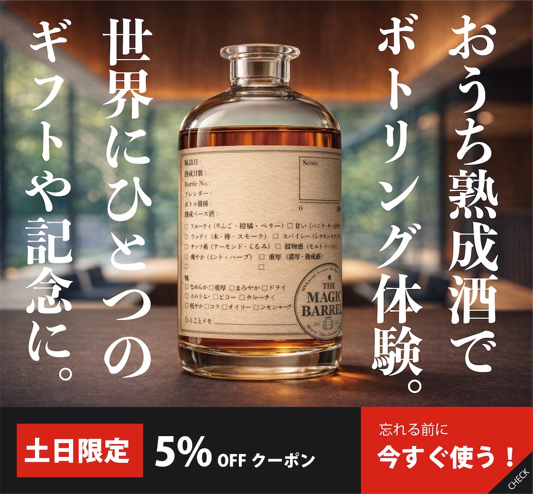 A:安いいつものウイスキーでもワンランク上の味わいになります。バーで熟成酒を飲むより圧倒的にコスパ良く楽しめます。