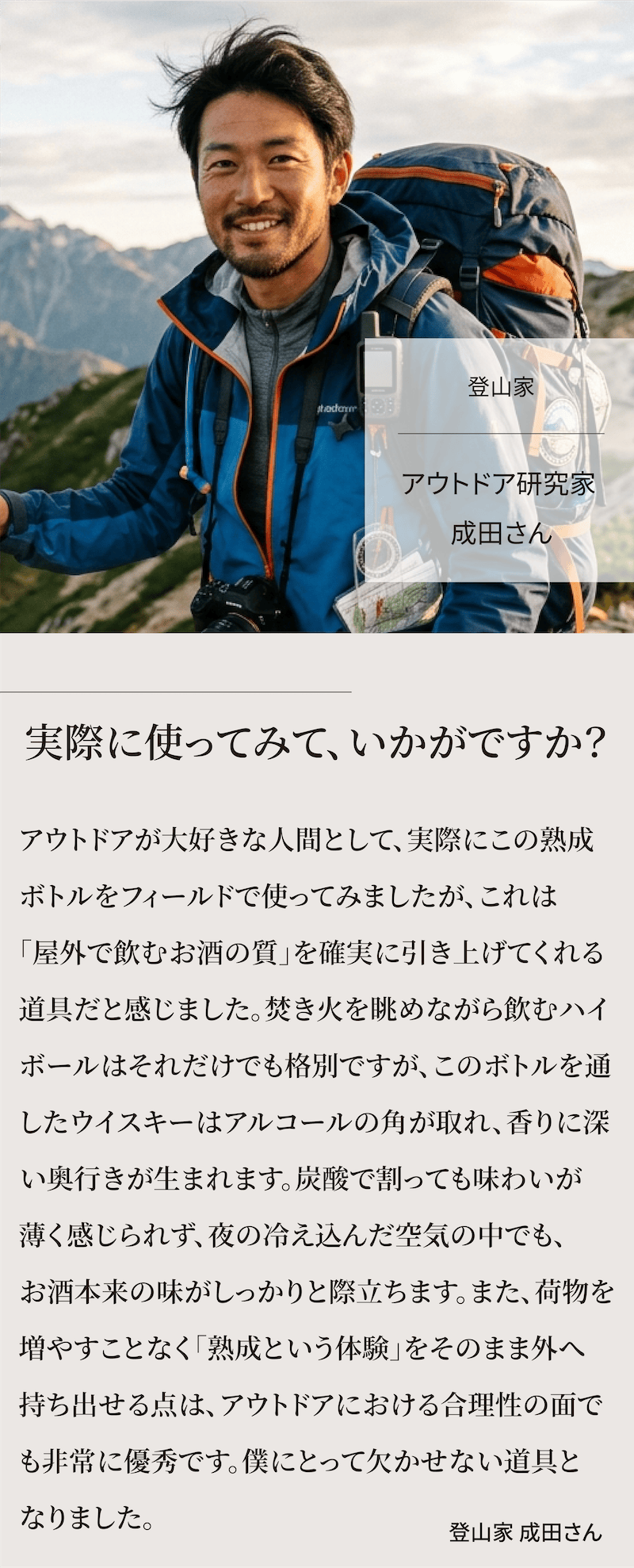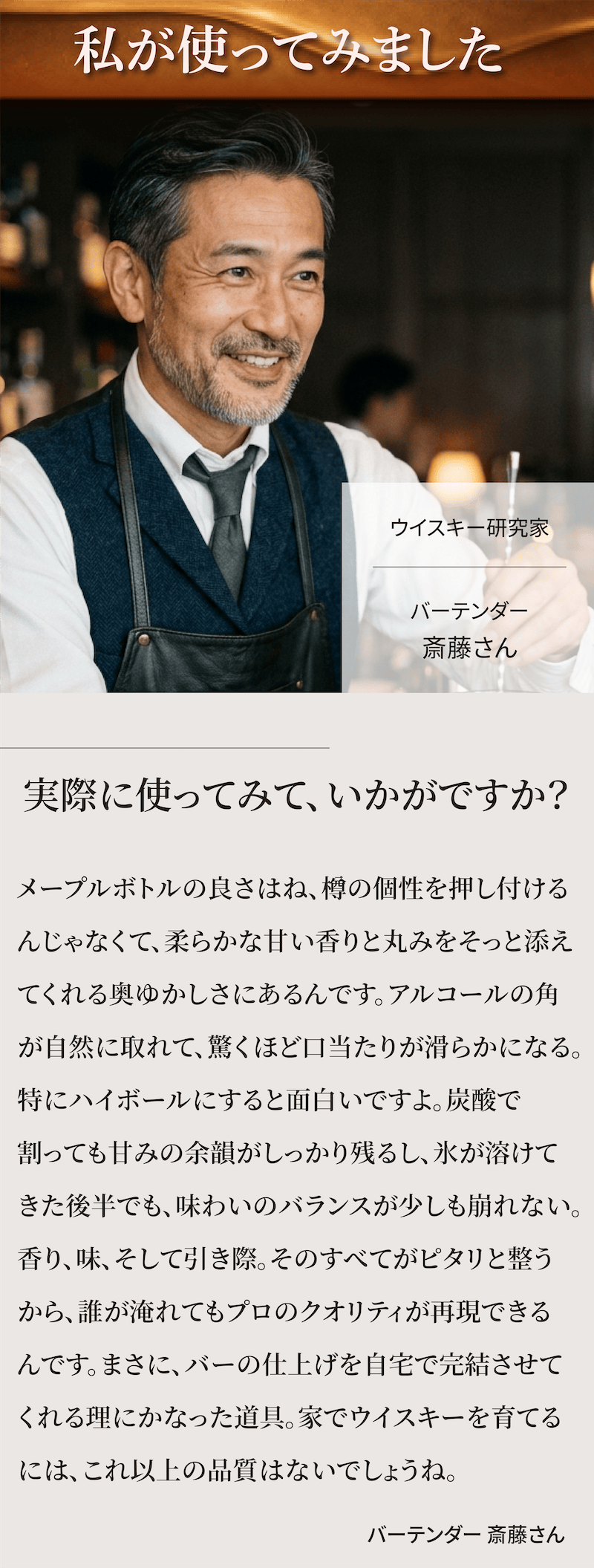 A:安いいつものウイスキーでもワンランク上の味わいになります。バーで熟成酒を飲むより圧倒的にコスパ良く楽しめます。