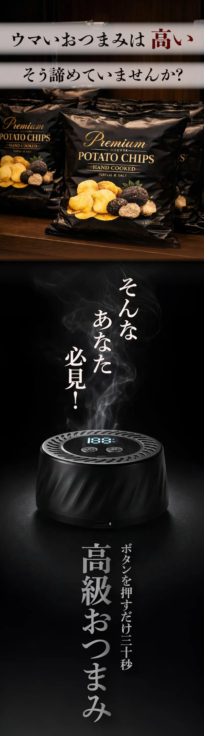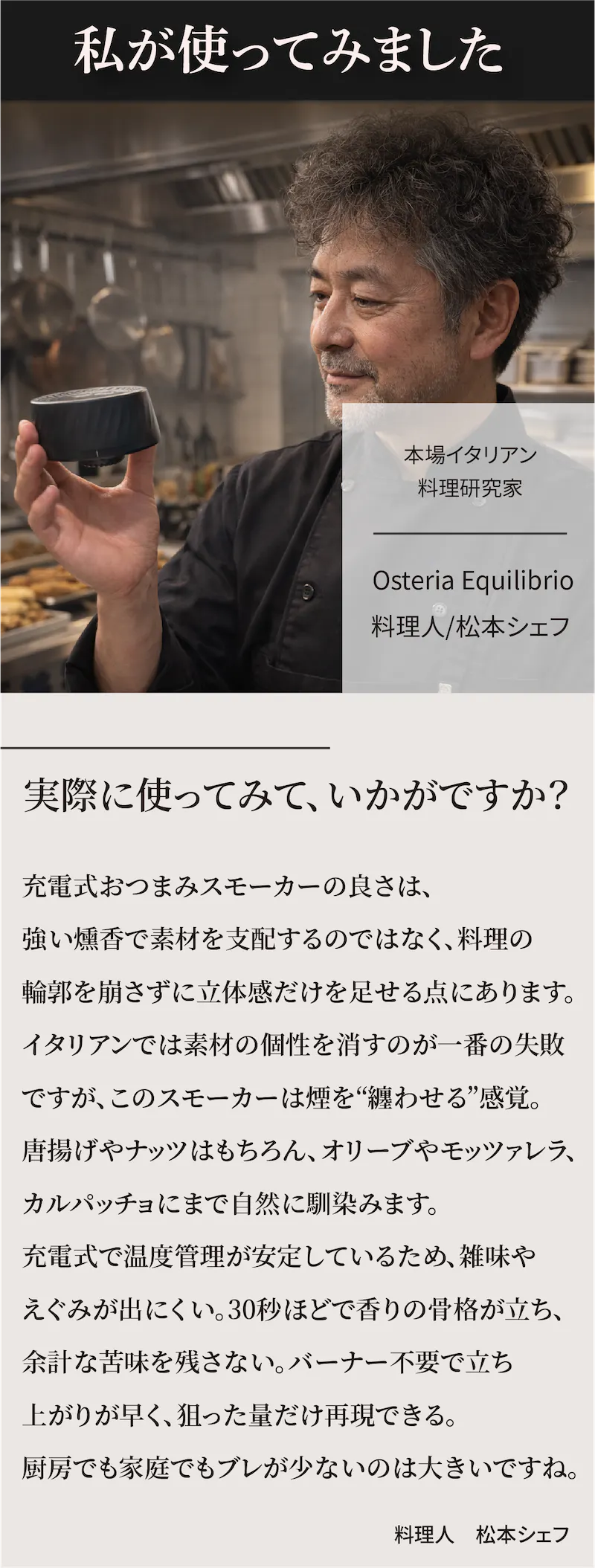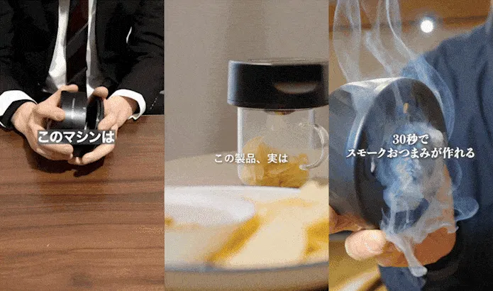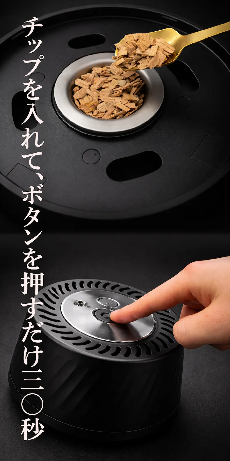 A. チーズ・ナッツ・卵・ポテチなどのおつまみから、塩や醤油などの調味料まで幅広い食材にご使用いただけます。また、ウイスキーなどのドリンクに香りを付けることも可能です。