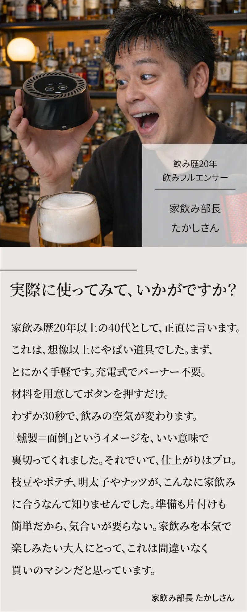 A. 1回の燻製時間は20秒の仕様です。お好みで、待ち時間や燻製回数をご調整ください。