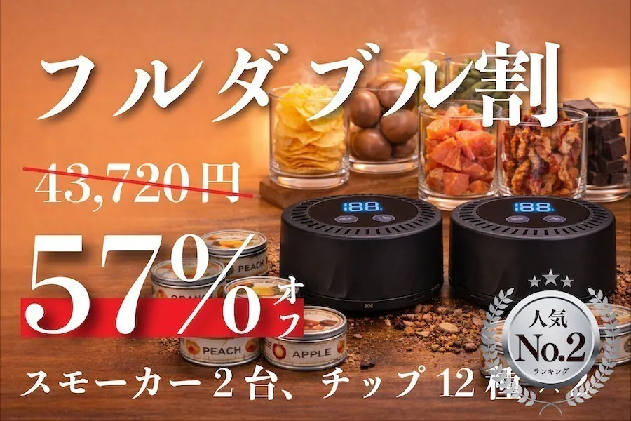 A. チップが付属しているセットがあります。りんご、チェリー、オーク、ブナなど全12種類をご用意しており、各チップ約45回の燻製ができます。